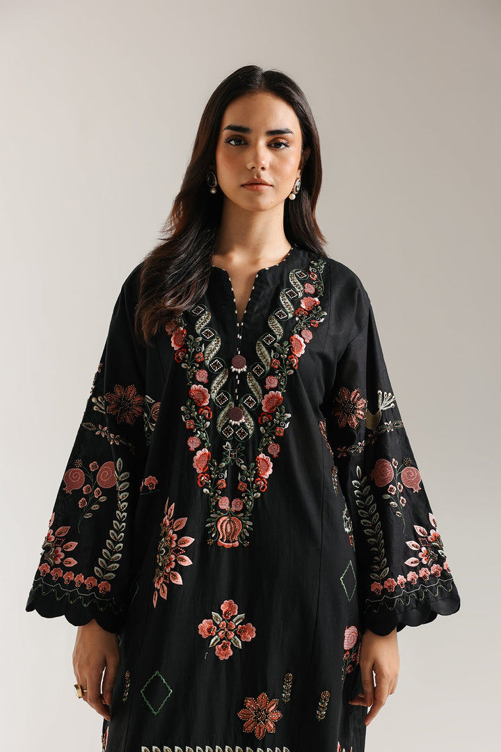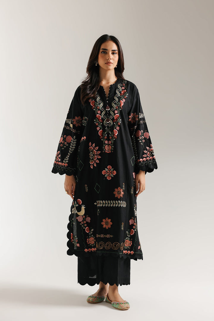 Unveil true festive glamour in this gorgeous black embroidered suit. The long, A line kurta is a stunning canvas of deep black, lavishly adorned with vibrant multi-colored floral thread embroidery. The intricate work, featuring shades of red, pink, green, and coral, is concentrated around the V-neckline and yoke and extends into bold, stylized floral and folk motifs across the entire shirt. The wide sleeves and hem are finished with a delicate scalloped cutwork border, adding an extra layer of exquisite detail. The ensemble is completed by coordinating black trouser that feature a matching scalloped embroidered hem, ensuring a cohesive and utterly luxurious traditional look.