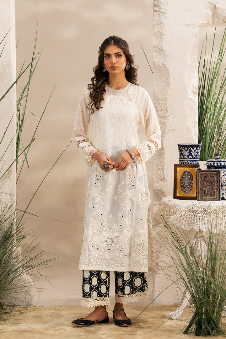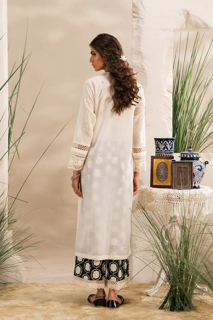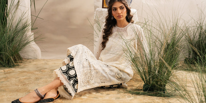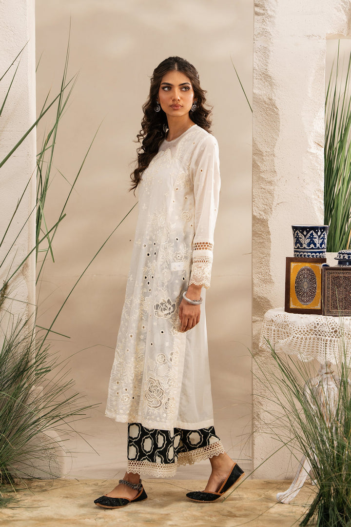 Radiate ethereal elegance in this stunning embroidered suit. The pristine white kurta is a canvas for intricate floral and geometric embroidery, complemented by delicate cutwork on the hem and sleeves that adds a touch of sophisticated artistry. This beautiful shirt is perfectly paired with a contrasting pair of black and white patterned trousers, creating a modern and striking ensemble that is a perfect blend of classic craftsmanship and contemporary flair.