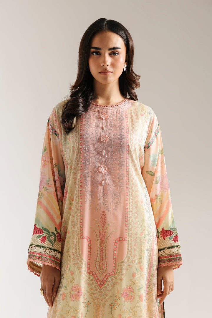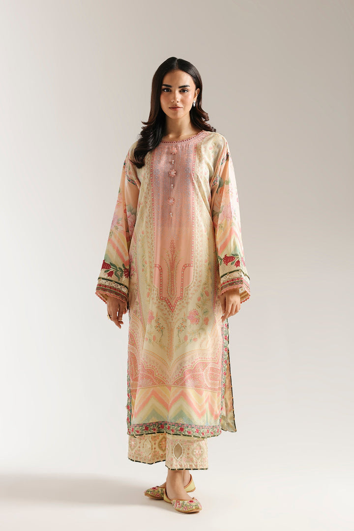 This artistic embroidered suit is a masterpiece of color and pattern. The long kurta is a stunning blend of printed motifs and intricate embellishments in a beautiful palette of pastel shades. The detailing around the neckline and on the sleeves gives the piece a graceful texture, perfectly complemented by the coordinating trouser with its delicate embroidered hem.