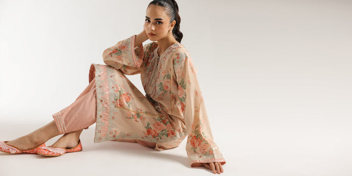 Indulge in the delicate charm of this nude-pink embroidered suit. The long, straight-cut kurta is crafted from a soft, lightweight fabric featuring an all-over photo-realistic floral print in shades of pink, rose, and green. The neckline is richly detailed with dense tonal thread and sequin embroidery, featuring elaborate heart motifs, tassels, and intricate borders. The hemline is beautifully finished with subtle gotta work. The ensemble is completed by coordinating shalwar in a matching soft pink, which feature a delicate border at the hem, offering a perfectly cohesive and feminine festive look.