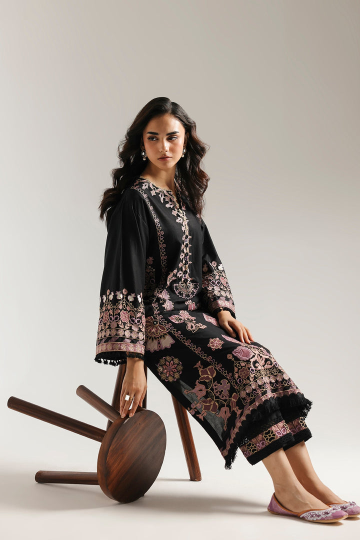 This elegant embroidered suit is a true statement piece. The deep black kurta provides a dramatic canvas for the vibrant, multi-colored embroidery in a sophisticated blend of floral, paisley, and geometric designs. With its beautifully detailed sleeves and a perfectly coordinated trouser, this ensemble is a stunning and artistic choice.