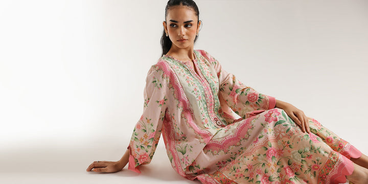 This breathtaking suit is a true work of art, featuring a stunning jacquard fabric with zari work that shimmers with a touch of gold. The shirt showcases a magnificent blend of intricate patterns and a rich color palette. The bodice and sleeves are adorned with a bold, geometric design in pink, and green, while the lower half of the dress bursts with a beautiful floral print in shades of pink, and beige. The cuffs and hem are finished with a delicate scalloped pink trim, adding an elegant detail. This piece effortlessly combines traditional craftsmanship with a majestic design, making it a perfect choice for a grand celebration. Paired with a matching culotte trouser.