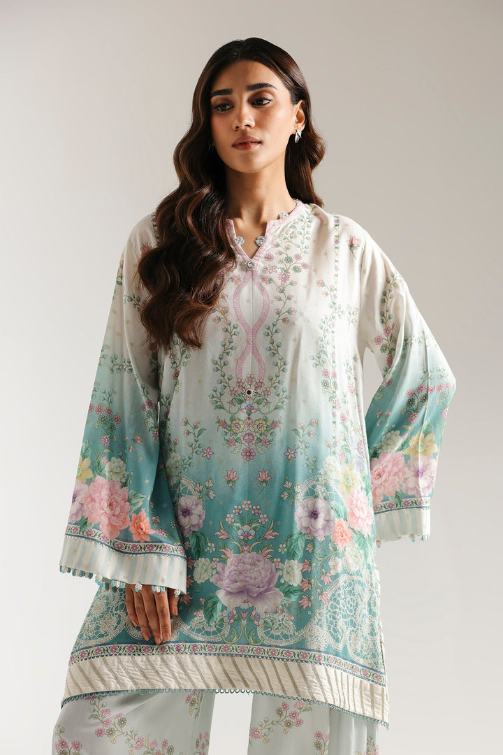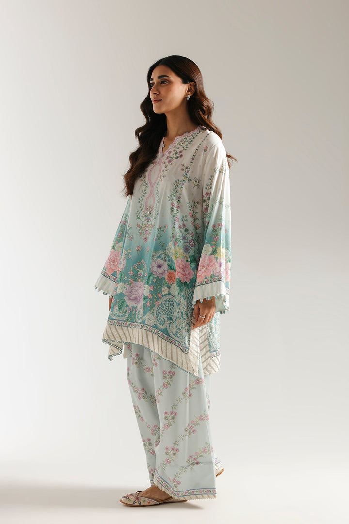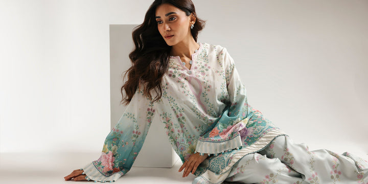 This graceful embroidered suit is a celebration of soft pastels and elegant floral motifs. The light blue kurta features a beautiful floral print in shades of pink, purple, and green, with subtle gotta work on hem and sleeves that adds a touch of sophistication. Paired with coordinating shalwar that have a complementary print, this ensemble creates a truly charming and refined look.