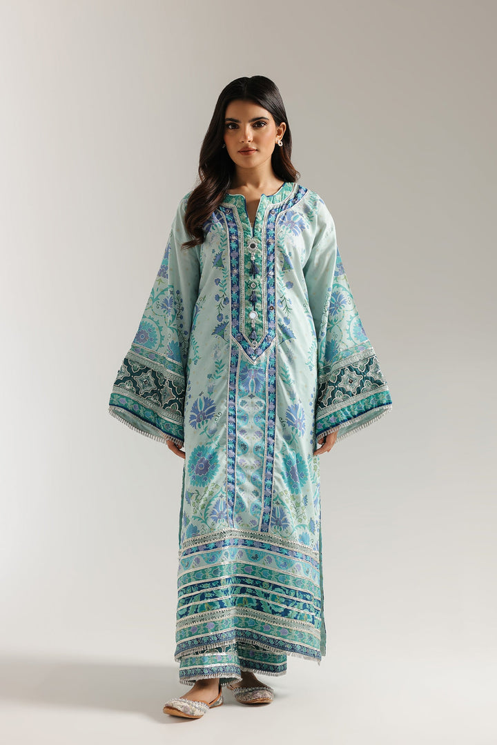 Dive into a world of serene elegance with this breathtaking suit, a masterpiece of intricate artistry. The long, flowing shirt is a canvas of tranquil aqua, adorned with a mesmerizing symphony of floral and ornamental patterns in rich blues, purples, and greens. The round neckline is beautifully highlighted by intricate gotta detailing placket, while the wide, bell-shaped sleeves and hem feature coordinating, ornate borders. This stunning ensemble is the epitome of sophisticated style and graceful design.