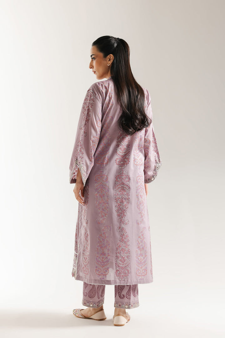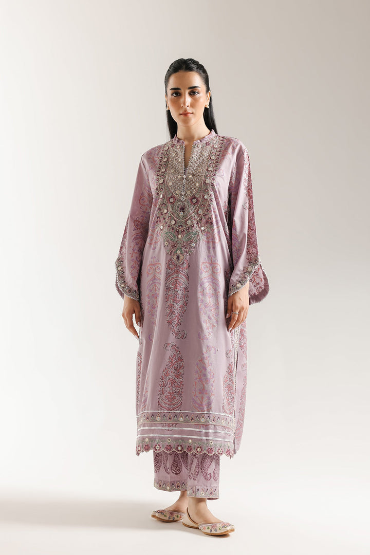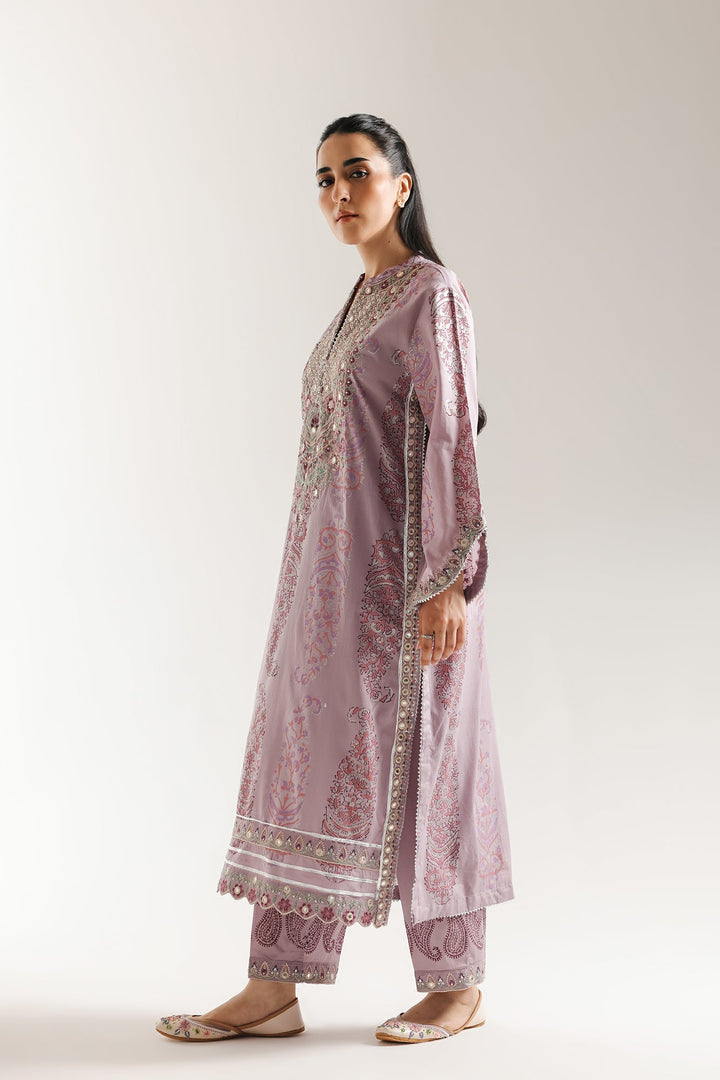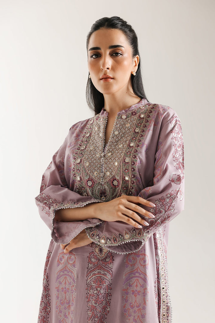 Envelop yourself in the majestic beauty of this stunning lilac embroidered suit. The long, straight-cut kurta is a vision of opulence, featuring a delicate all-over paisley and floral print in shades of dusty purple and subtle grey. The high neckline is the focal point, heavily embellished with intricate embroidery, creating a stunning, statement yoke. The hem and wide tulip sleeves are finished with coordinating borders and elegant gotta trim. The ensemble is completed by coordinating trouser that feature a matching all-over paisley print, creating a harmonious and utterly regal traditional outfit.
