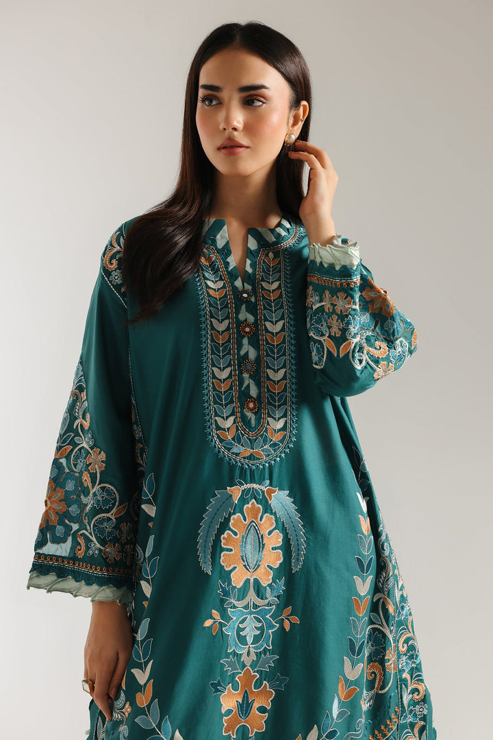 Immerse yourself in the captivating charm of this teal embroidered ensemble, a stunning fusion of rich color and intricate artistry. The vibrant teal tunic features a graceful ban neck with a V slit, beautifully adorned with striking embroidery in shades of rust, gold, and light blue, creating elaborate floral and ornamental motifs across the front. The full-length sleeves are a highlight, showcasing subtle embroidery, finished with delicate light green fringe trim for added flair. The shirt's hem is also intricately designed with a large, ornate embroidered border, making a powerful statement. Complementing this exquisite shirt are perfectly tailored straight trousers in a matching teal, subtly accented with embroidered motifs at the hem, creating a cohesive and visually stunning look.