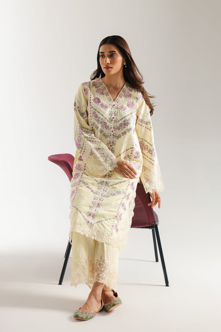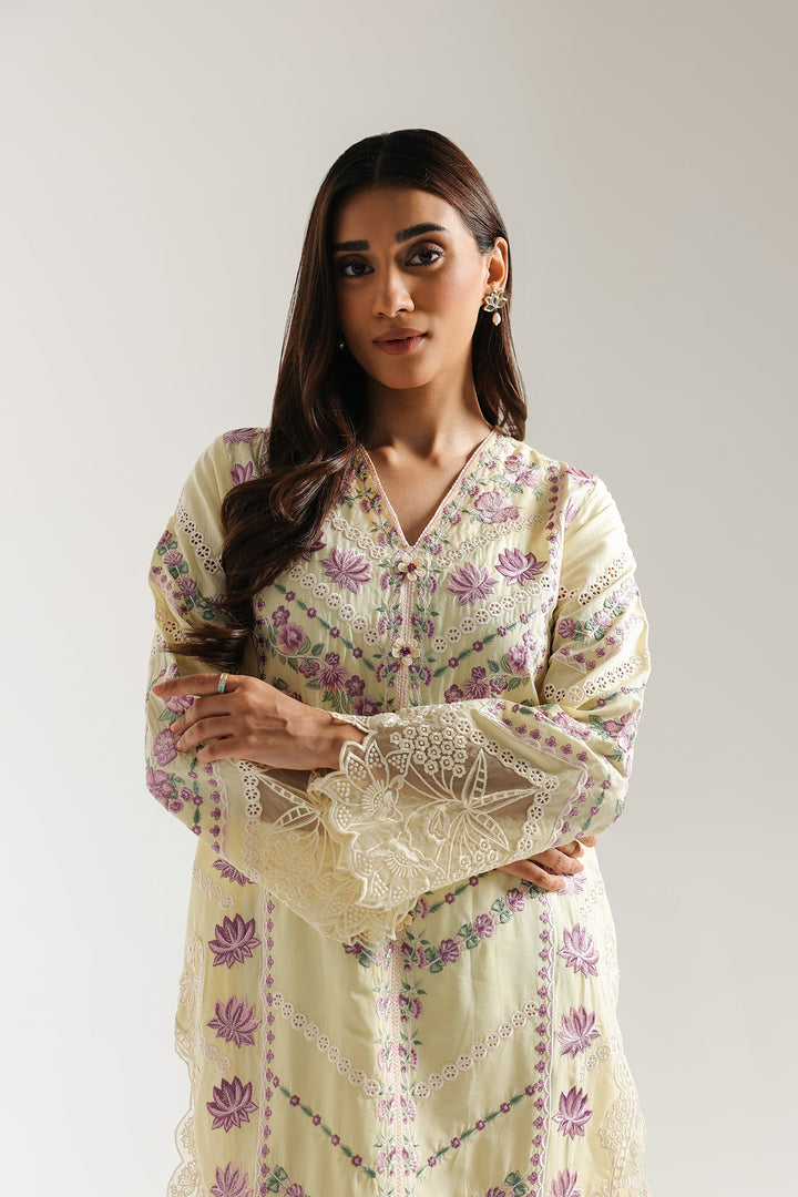 This ethereal suit is a vision of delicate elegance, rendered in a soft yellow beige hue. The long-line shirt is adorned with exquisite, vertical floral embroidery in shades of light purple and green, creating a gracefully flowing design. The V-neckline, sleeves, and shirt hem are all finished with a stunning scalloped lace trim that adds an airy, romantic touch. The ensemble is completed with matching trousers, also detailed with the same intricate lace at the cuff, for a look that is both refined and enchanting.