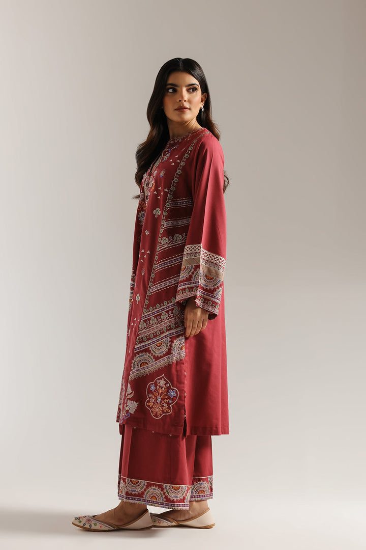 This exquisite suit is a beautiful showcase of intricate embroidery and rich color. The long tunic in striking hot pink hue serves as a perfect backdrop for the elaborate, multi-colored patterns. The embroidery features a captivating mix of floral and paisley motifs that flow from the neckline down the front and across the wide, flared sleeves. The tunic is paired with matching trousers that feature a complementary embroidered border, creating a cohesive and stunning ensemble. This outfit is a true statement piece, ideal for a festive occasion or an elegant gathering.