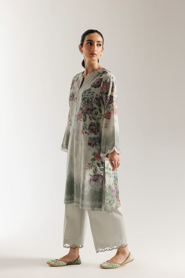 Elegance meets artistry in this sage and grey embroidered suit. The long, straight-cut kurta is crafted from a soft fabric with a stunning all-over watercolor-style floral print in muted tones of lavender, plum, sage green, and taupe. The V-slit neckline is beautifully highlighted with delicate sequin work. The hem and sleeve cuffs are finished with a sophisticated scalloped cutwork border. The ensemble is completed by coordinating straight-cut trouser in a solid, complementary light stone grey. This suit offers a gracefully soft yet impactful traditional look.