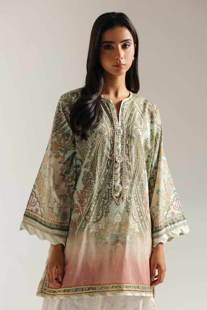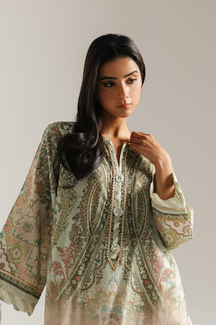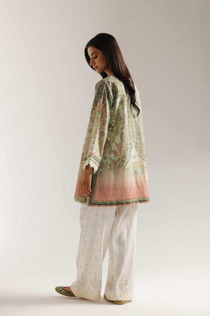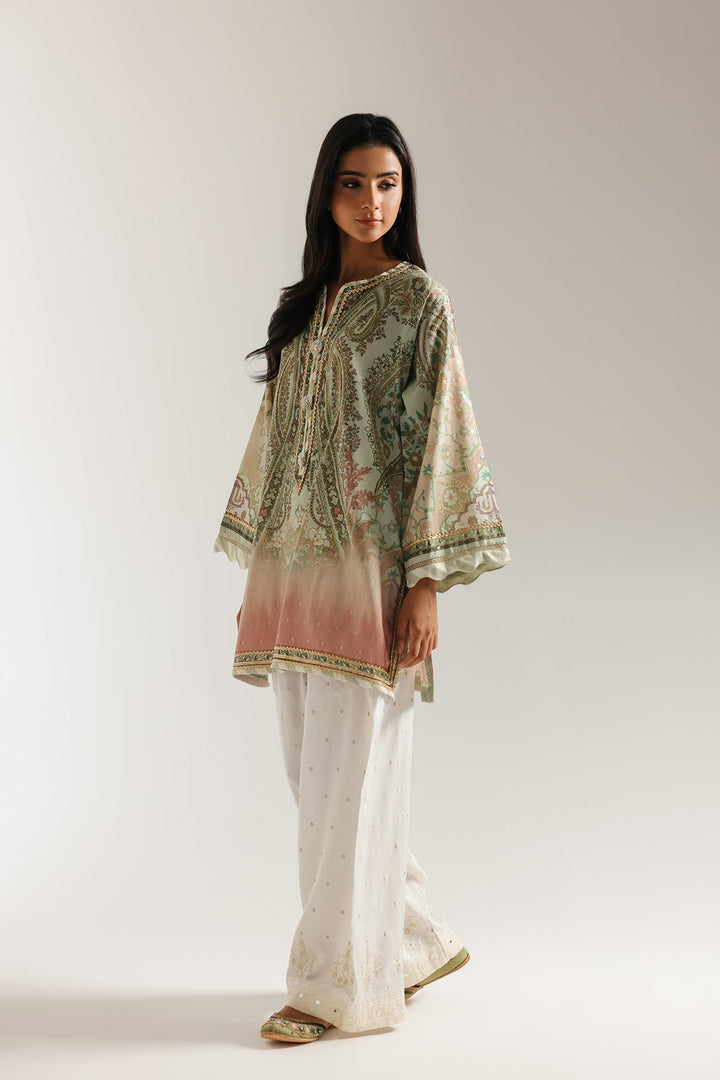 Experience the charm of classic elegance with this jacquard suit. This two-piece ensemble features a shirt with an intricate paisley and floral print in shades of green, pink, and orange. The shirt is complemented with wide-leg shalwar that feature delicate zari dots and a beautiful border. This suit is the perfect choice for making a sophisticated statement at any event.