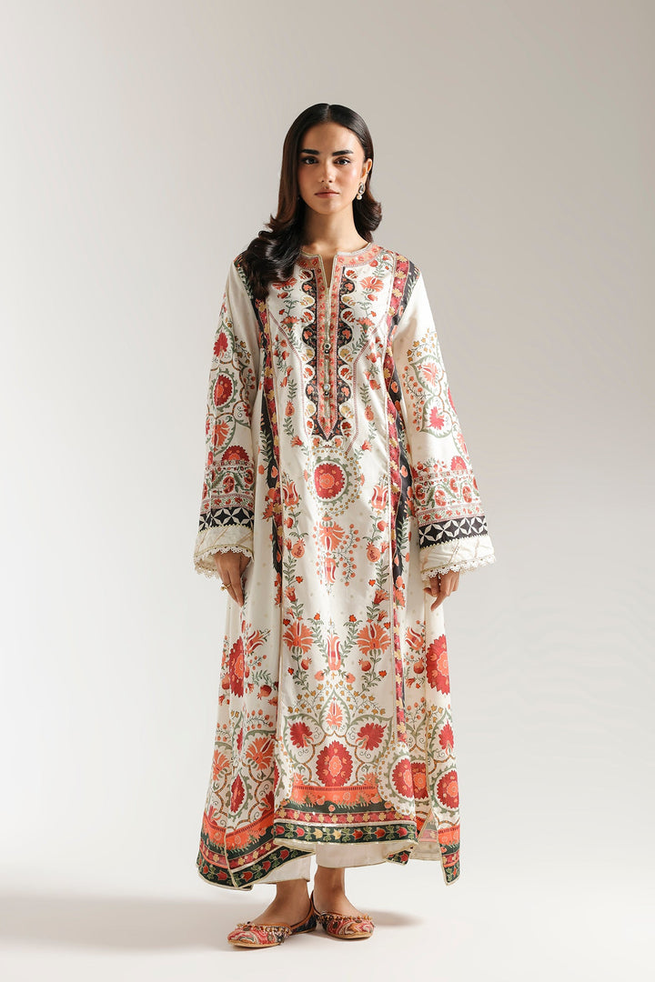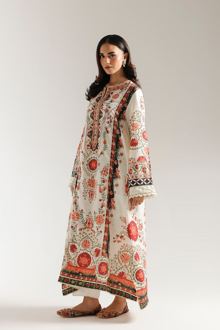 This breathtaking embroidered suit is a masterpiece of traditional artistry. The long, flowing off-white kurta is richly adorned with an all-over print and intricate embroidery, featuring vibrant floral and botanical motifs in striking shades of red, orange, and green. The intricate patterns extend to the wide sleeves and a beautifully detailed border at the hem. Paired with a complementary trouser, this ensemble creates a truly magnificent and unforgettable look
