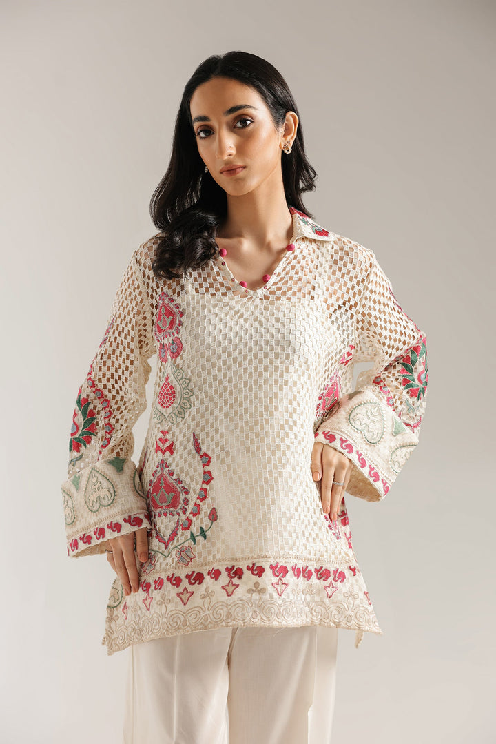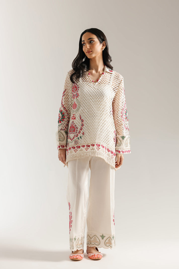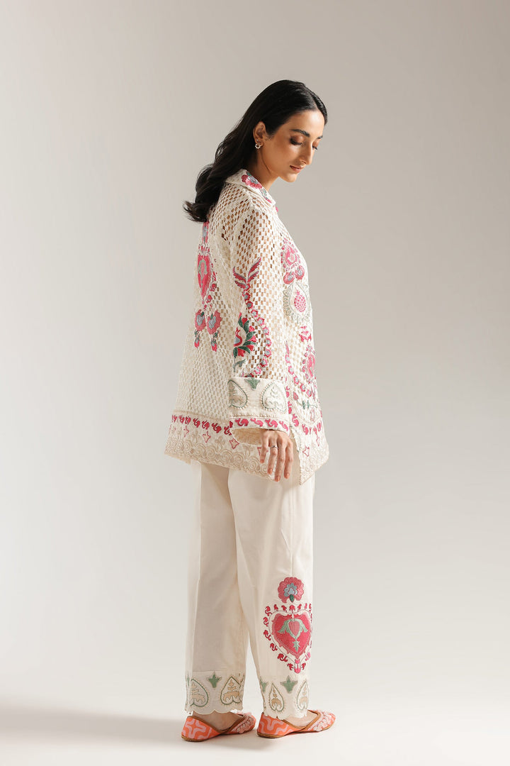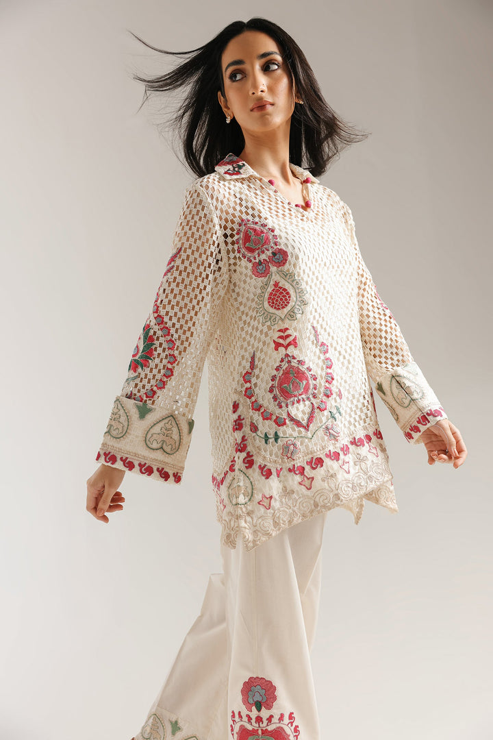 This exquisite three-piece suit is a masterful blend of delicate craftsmanship and stunning design. The elegant ivory ensemble features an open-weave, lattice-patterned tunic with a beautiful texture. It is artfully adorned with elaborate, multi-colored floral and paisley embroidery on the sleeves and shoulders, creating a striking visual contrast. The suit includes a simple slip for coverage and is paired with relaxed-fit trousers that are finished with a broad, embroidered border at the hem. This graceful outfit is a perfect choice for a special occasion, offering a sophisticated and detailed look.