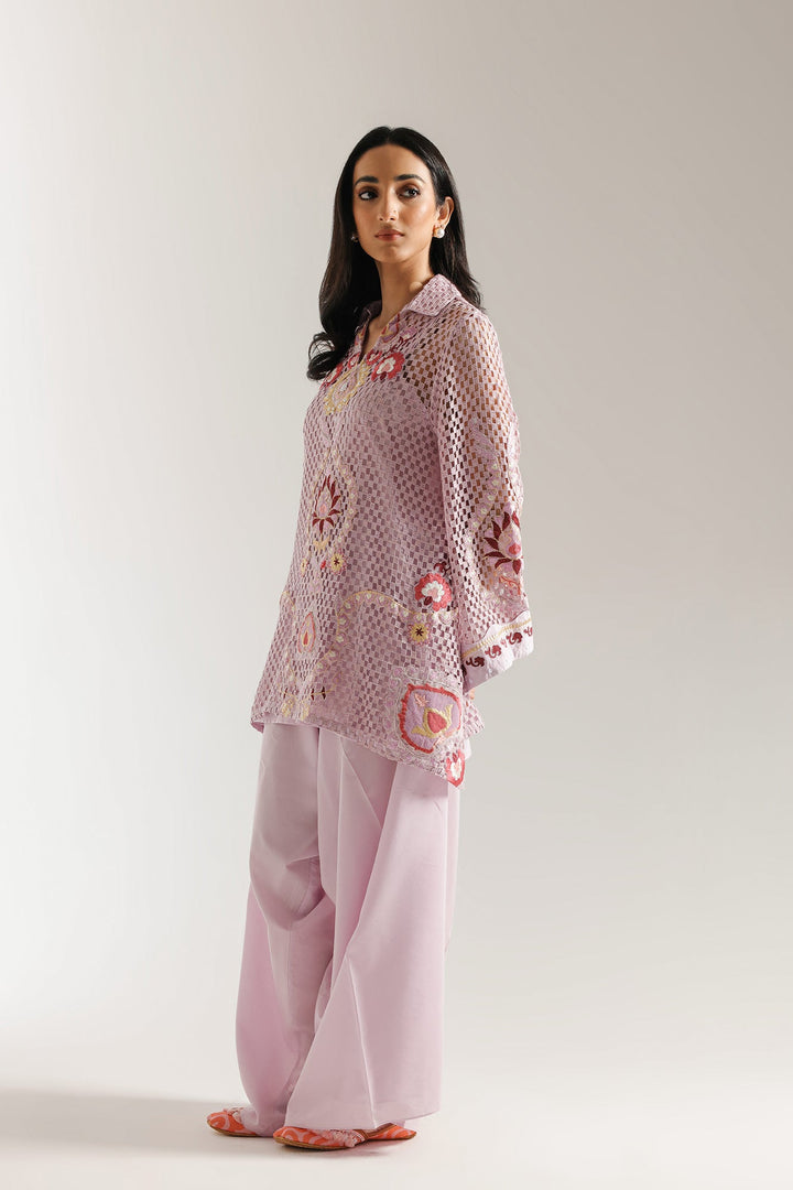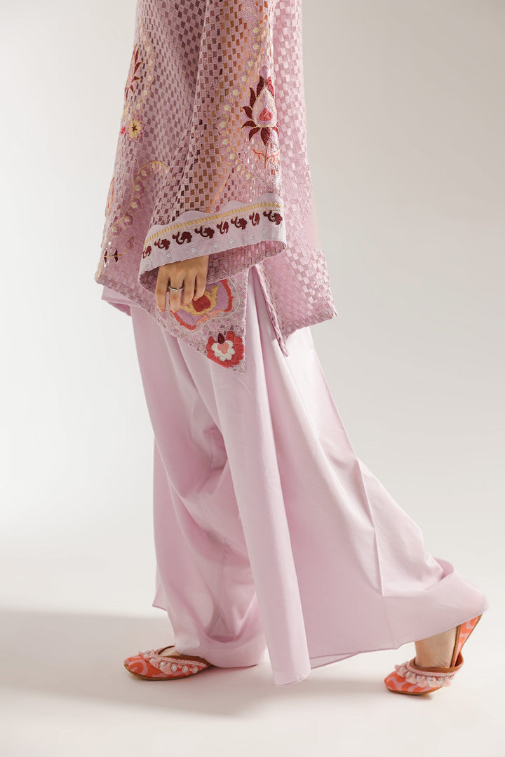This elegant embroidered suit is a masterpiece of texture and design. The light purple open-work shirt features intricate floral embroidery in a rich palette of pinks, whites, and maroon. The shirt is perfectly paired with a smooth slip and a perfectly coordinated shalwar, making this ensemble a sophisticated and artistic choice.
