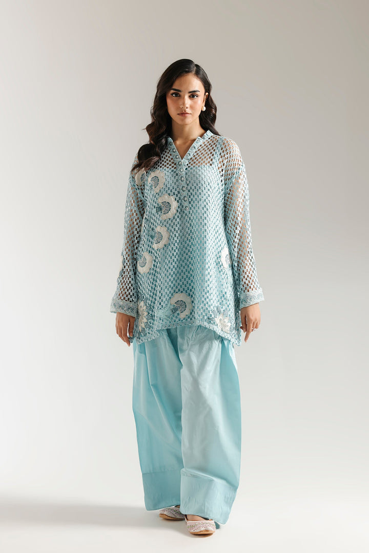 This elegant embroidered suit is a masterpiece of texture and style. The light blue crocheted shirt features intricate white floral embroidery, perfectly complemented by a smooth inner slip for comfort and coverage. The ensemble is completed with a coordinating farshi shalwar that drapes beautifully, making this a unique and sophisticated choice for any special event.