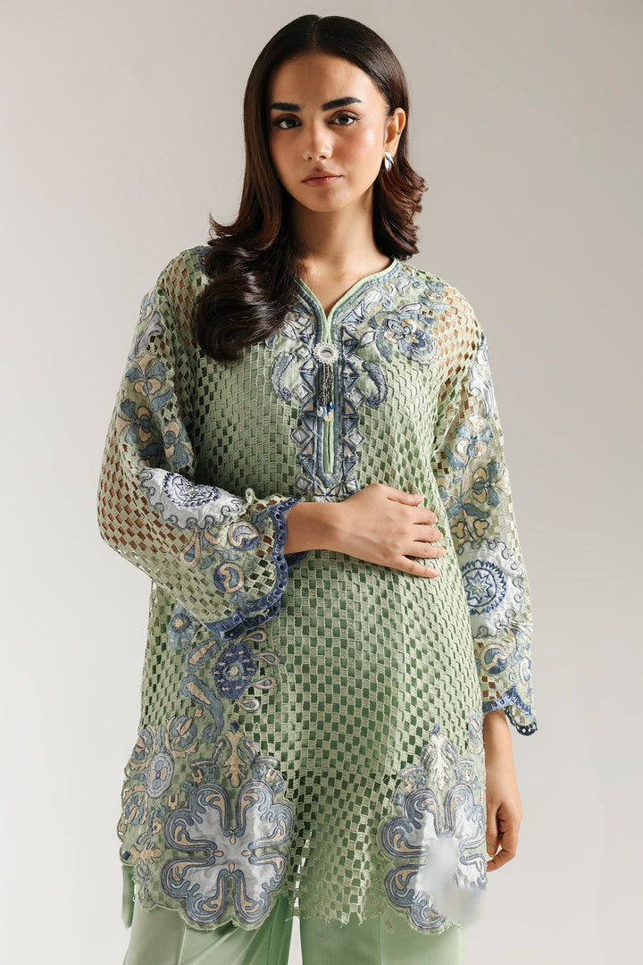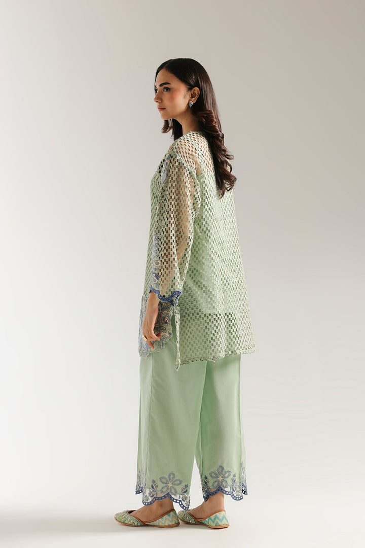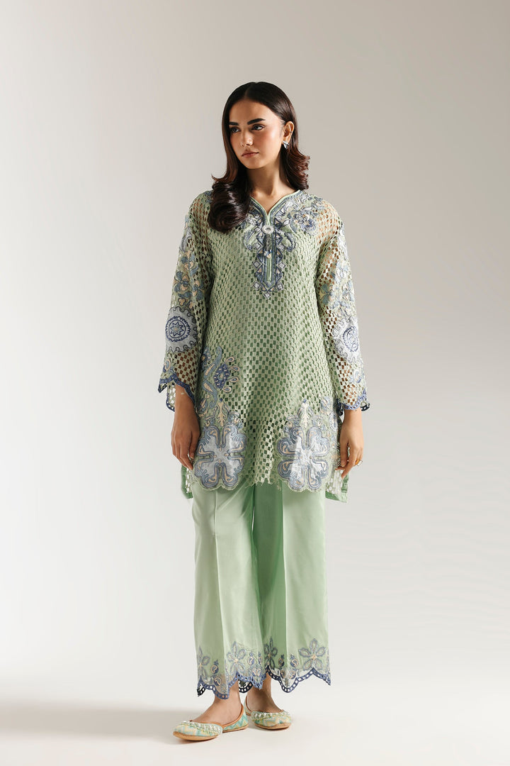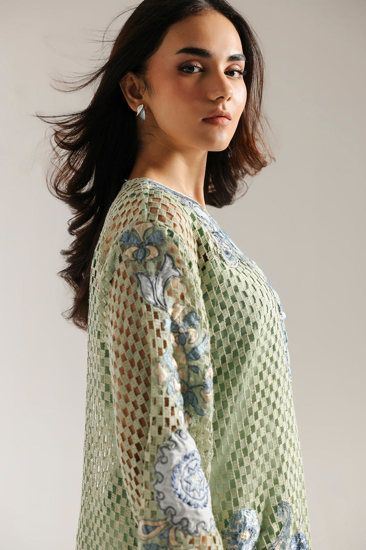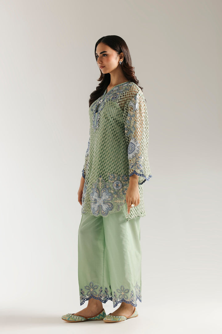 This elegant embroidered suit is a masterpiece of texture and style. The light green crocheted shirt features intricate blue floral embroidery, perfectly complemented by a smooth inner slip for comfort and coverage. The ensemble is completed with a coordinating trouser that drapes beautifully, making this a unique and sophisticated choice for any special event.