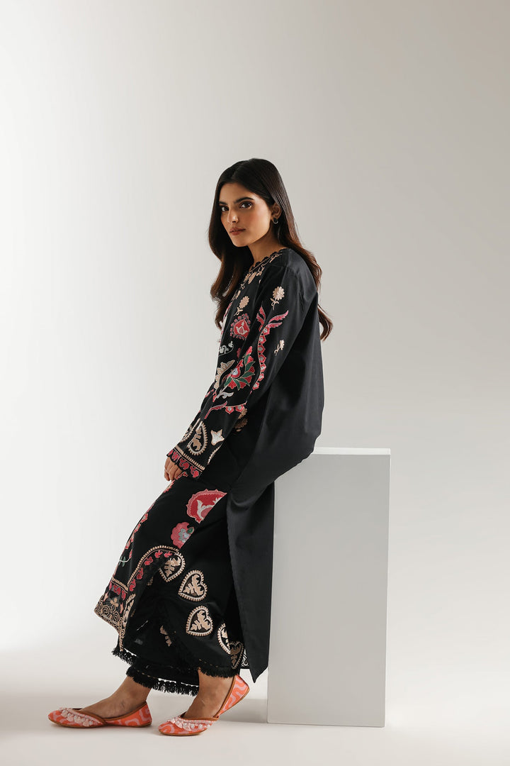This dramatic embroidered suit is a masterpiece of design. The deep black kurta is richly adorned with intricate embroidery in a vibrant palette of maroon, pink, and gold. The stunning, all-over pattern and beautifully detailed hem create a sophisticated and artistic look, while a perfectly coordinated trouser completes this captivating ensemble.