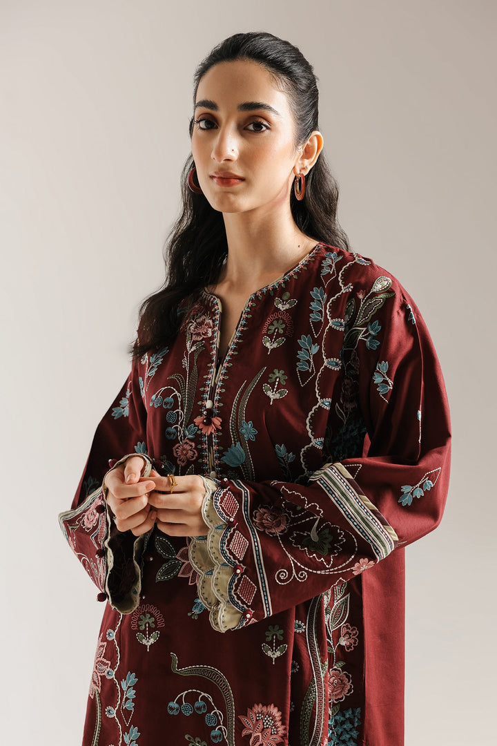 Experience the splendor of this exquisite embroidered suit, a fusion of rich color and delicate artistry. This stunning two-piece ensemble is crafted from a beautiful maroon fabric that serves as the perfect backdrop for its intricate design. The long shirt features elaborate, stylized floral and vine embroidery in a palette of light pink, blue, green, and white. The detailed threadwork and subtle sequin embellishments on the neckline, front, and sleeves create a look of opulent elegance. The suit is completed with matching trousers, making it an ideal choice for any festive event or special occasion.