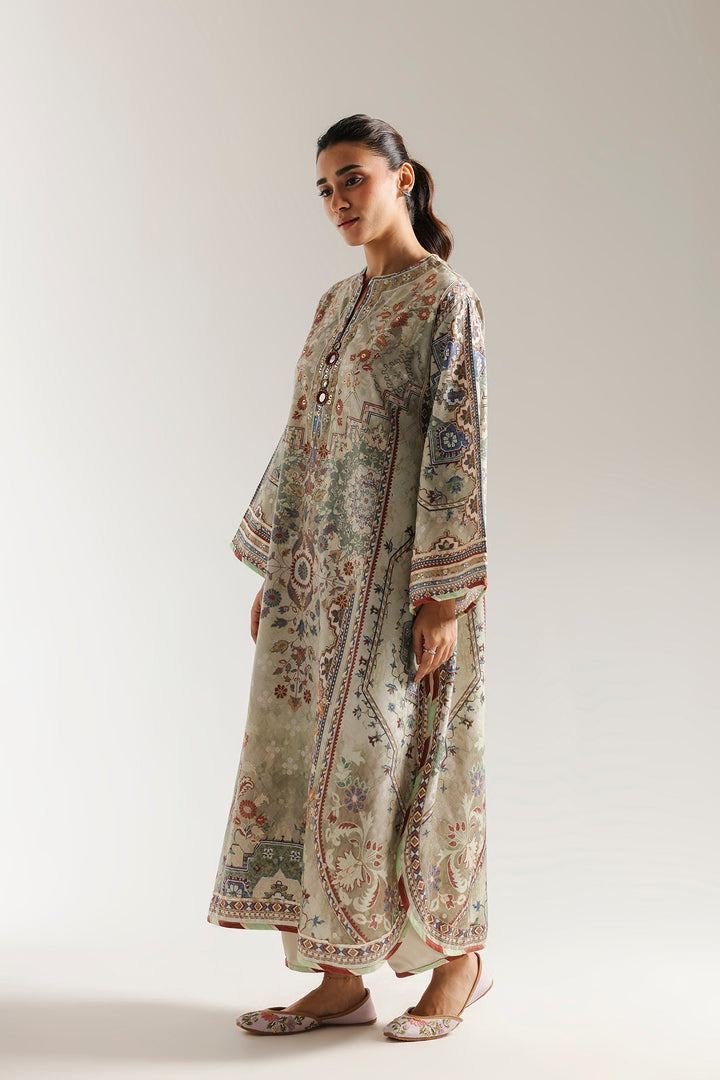 This stunning printed suit is a true work of art, reminiscent of exquisite tapestries. The long kurta is adorned with an all-over intricate print, featuring a rich palette of muted greens, blues, and reds in traditional floral and geometric patterns. Paired with coordinating trousers, this ensemble creates a captivating and timeless look.