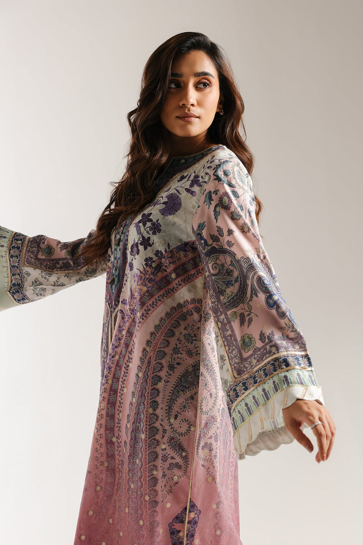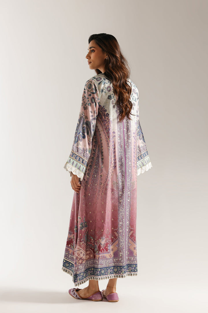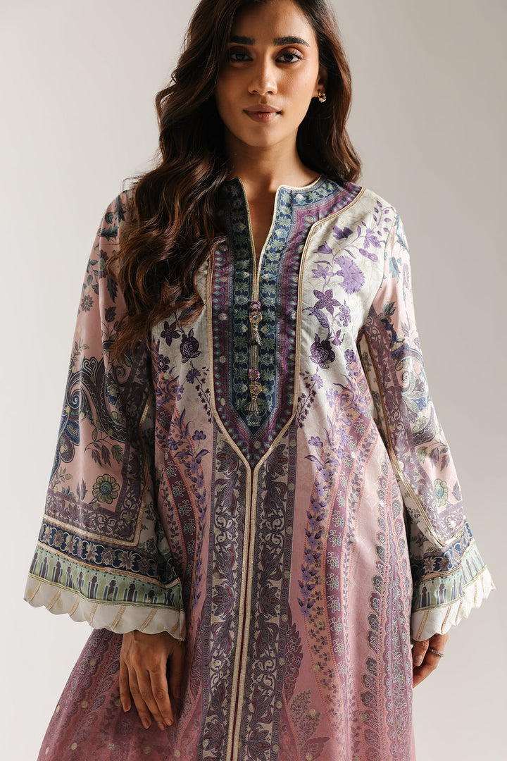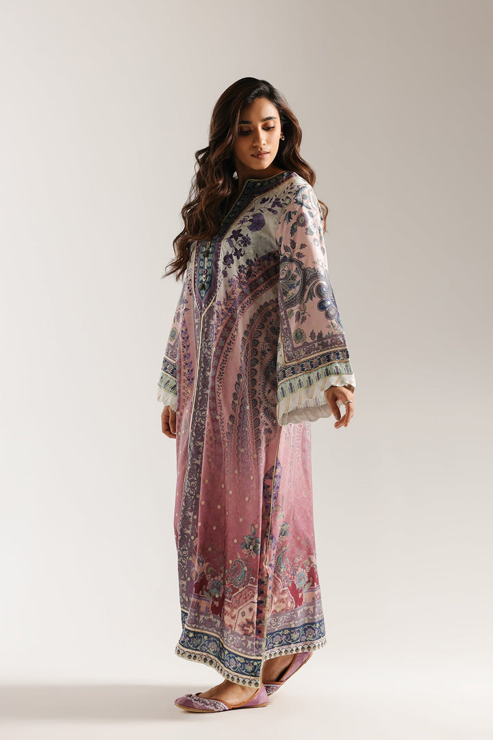 over a luxurious blend of art and style with this elegant jacquard Shirt. This beautiful, long shirt features a multi-panel design with intricate patterns in a sophisticated palette of pink, lavender, and soft blue. The graceful silhouette is complemented by long, bell-shaped sleeves with delicate scalloped trim, while the gotta work adds a touch of artisanal charm. A truly refined and timeless piece for your wardrobe.