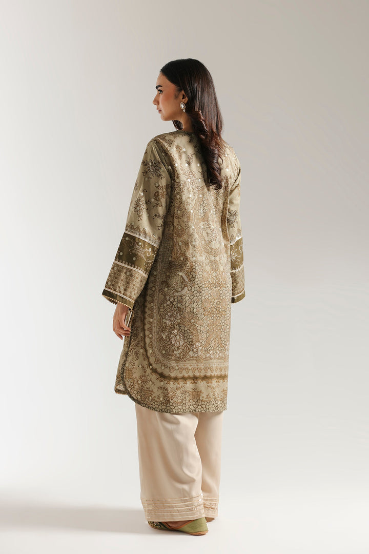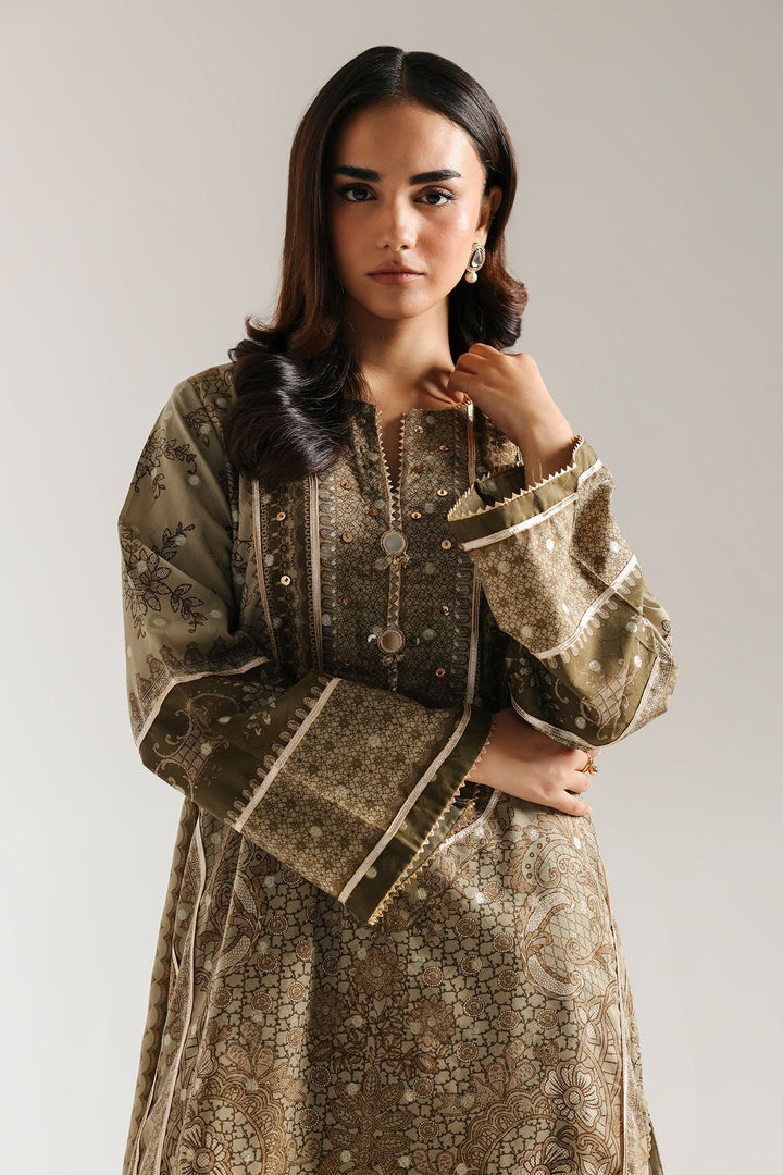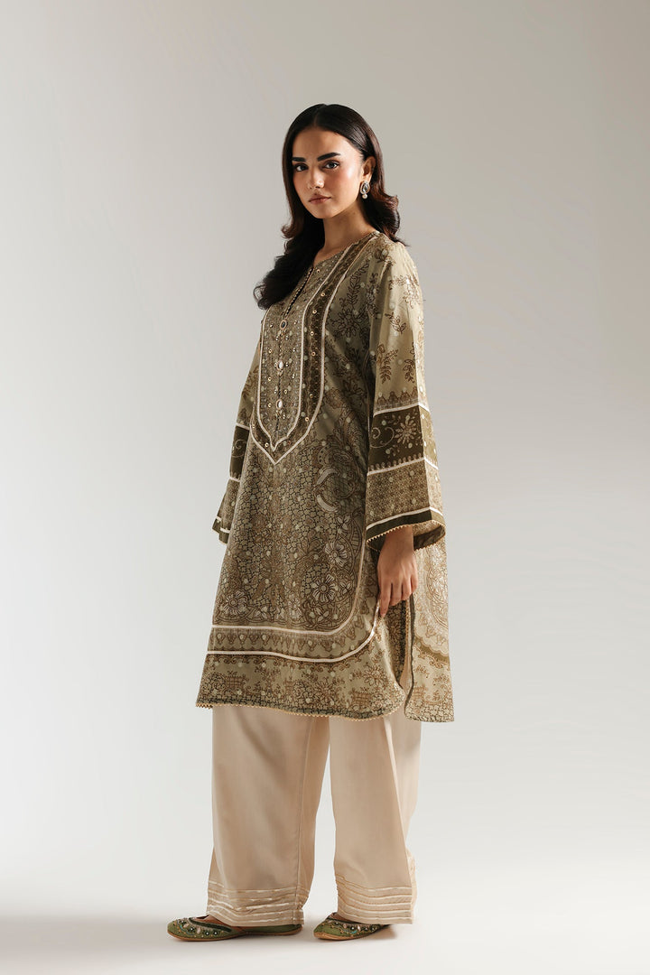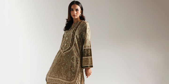 This sophisticated printed suit is a study in elegant detail. The rich, olive-toned kurta is adorned with a mesmerizing all-over print in a beautiful tapestry-like pattern. Shimmering embellishments run down the neckline and sleeves, adding a touch of glamour, while a chic, solid farshi shalwar completes this stunning ensemble.