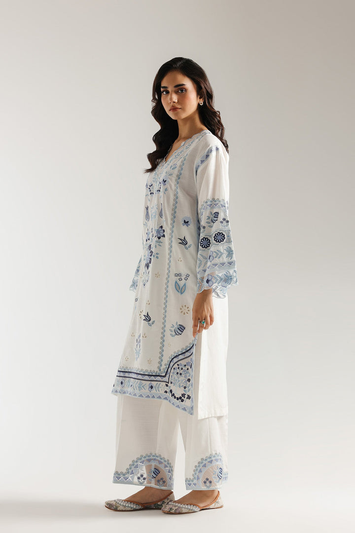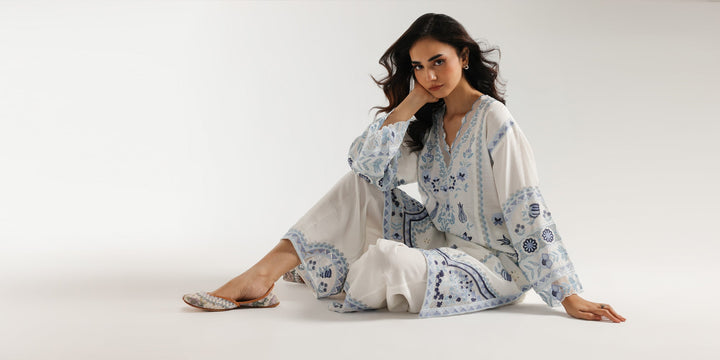 Embrace a breath of fresh elegance with this charming white & blue embroidered ensemble. The pristine white tunic features a graceful V-neckline, beautifully adorned with intricate embroidery in various shades of blue, creating captivating floral and geometric patterns across the front. The full-length sleeves are a highlight, showcasing elaborate embroidered motifs that echo the designs on the tunic's body, adding to its sophisticated appeal. Complementing this stunning shirt are perfectly tailored straight trousers in matching white, which feature a coordinating embroidered border at the hem, creating a cohesive and effortlessly elegant silhouette. Perfect for festive celebrations, daytime gatherings, or any occasion where you desire to exude serene grace and artistic flair.