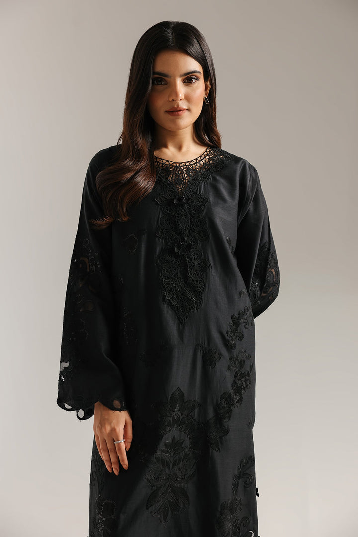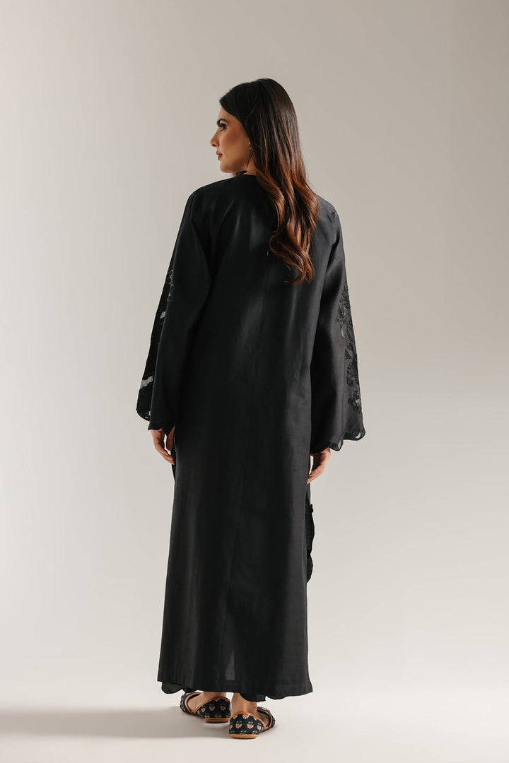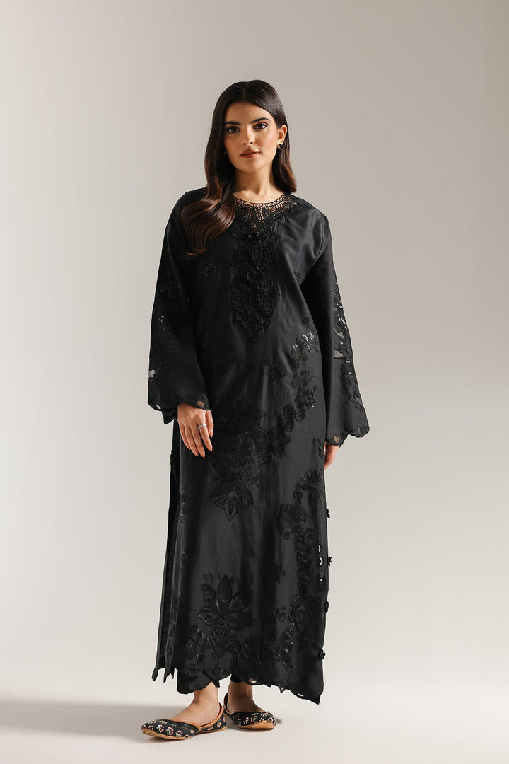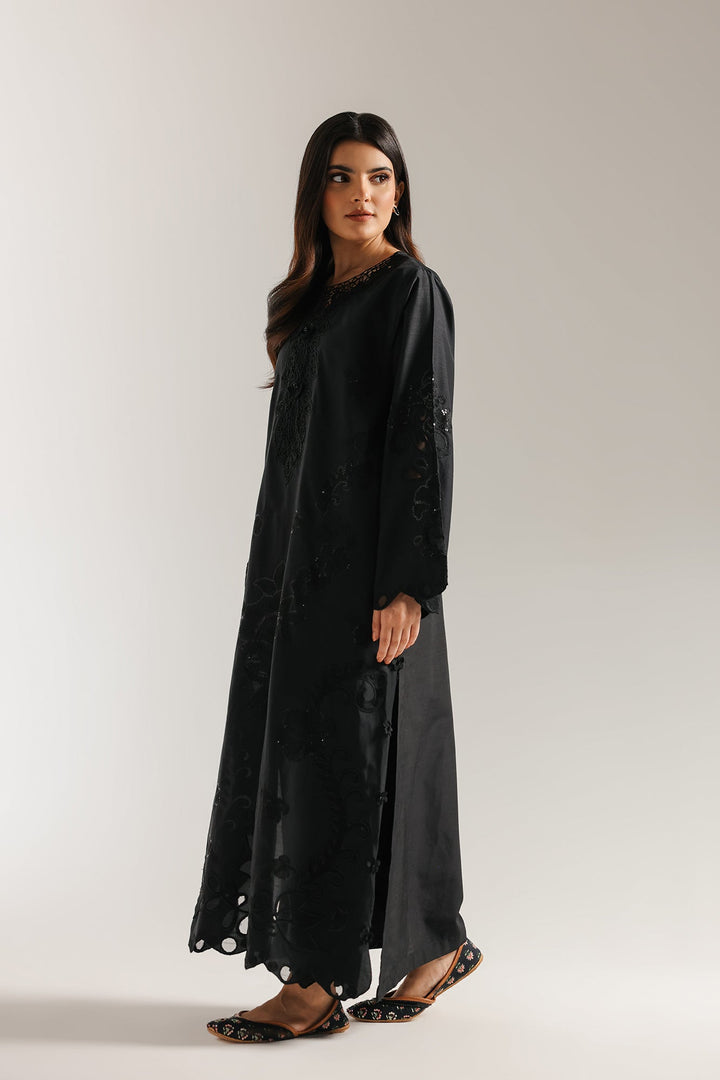 This striking embroidered suit is a celebration of sophistication and intricate detail. The long, flowing black tunic is a perfect canvas for the elegant tone-on-tone embroidery and sequin embellishments. The detailed floral and vine motifs are artfully placed down the front and on the wide, flared sleeves, creating a beautiful texture and a touch of subtle sparkle. The neckline features a delicate, embroidered scalloped trim, adding to its refined look. Paired with a relaxed-fit trouser, this suit is a truly captivating and stylish choice for an evening event.