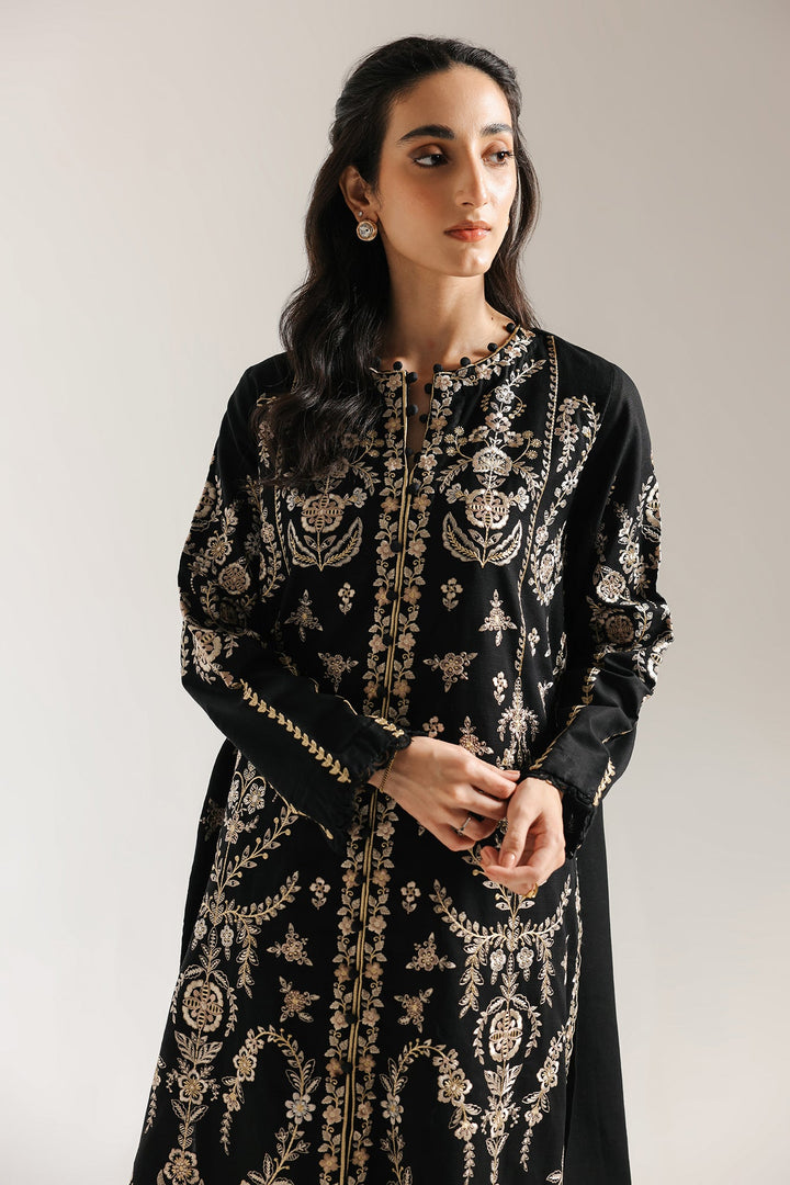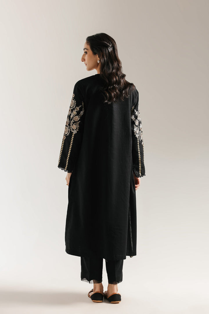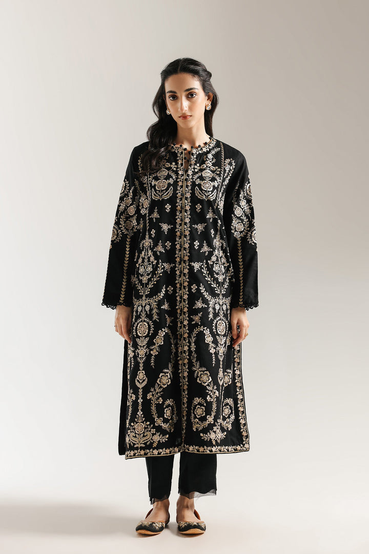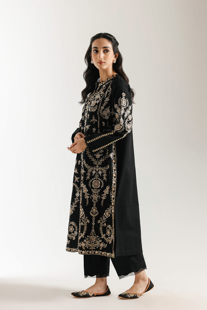 This magnificent suit features a long, elegant black tunic lavishly adorned with exquisite gold and white embroidery. The intricate floral and vine motifs cover the entire front of the shirt, creating a striking and luxurious pattern. The detailed embroidery also extends down the full-length sleeves, and the tunic's hem is finished with a delicate scalloped trim. Paired with simple black trousers, this stunning ensemble is a perfect example of timeless elegance, making it ideal for a special event or festive celebration.