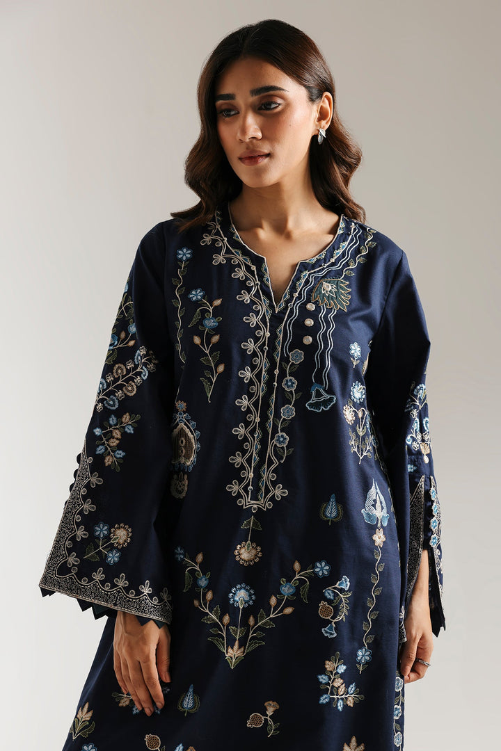 This exquisite embroidered suit is a symphony of delicate detail and rich color. The deep navy blue kurta is beautifully adorned with intricate floral and botanical embroidery in a graceful palette of light blue, cream, and subtle gold accents. With its elegant wide sleeves and a perfectly coordinated trouser, this ensemble creates a captivating and refined look.