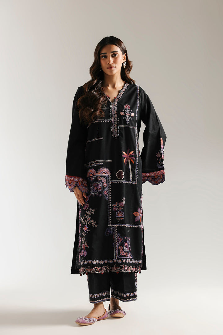 This artistic embroidered suit is a bold statement of style. The deep black kurta is a canvas for intricate, multi-colored embroidery, featuring a captivating embroidery of abstract, geometric, and floral motifs. With its elegant wide sleeves and a perfectly coordinated trouser, this ensemble beautifully blends traditional craftsmanship with a modern, sophisticated design.