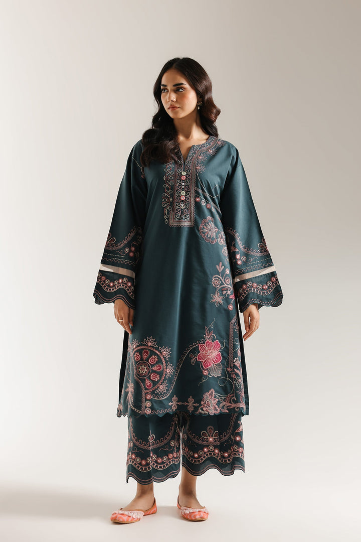 Immerse yourself in the deep, luxurious tones of this stunning embroidered suit. The long, straight-cut kurta is crafted from a rich, dark teal/pine green fabric. It is lavishly adorned with bold floral and geometric thread embroidery in vibrant pink, magenta, and subtle white hues. The embroidery details the neckline, runs down the front panel, and highlights the wide, straight sleeves. The ensemble is completed by coordinating trouser in the same deep teal color, featuring matching intricate floral embroidery along the hem. This suit delivers a sophisticated and festive traditional statement.