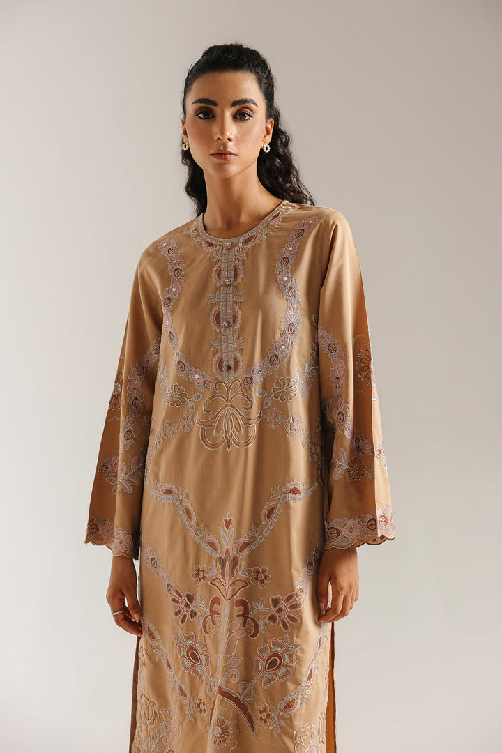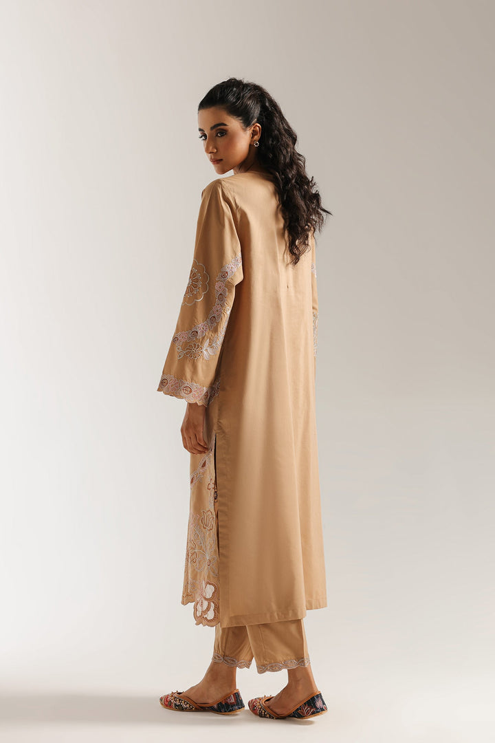 This stunning suit features a graceful and sophisticated design in a soft, earthy tone. The long tunic is beautifully adorned with intricate embroidery in shades of light brown and dusty rose. The elaborate floral and vine patterns flow down the front, across the full sleeves, and around the neckline. The hemline of the tunic is a standout feature with its elegant scalloped edge. The suit is completed with matching trouser, creating a cohesive and polished look. This outfit is a perfect blend of comfort and elegance, ideal for a variety of occasions.