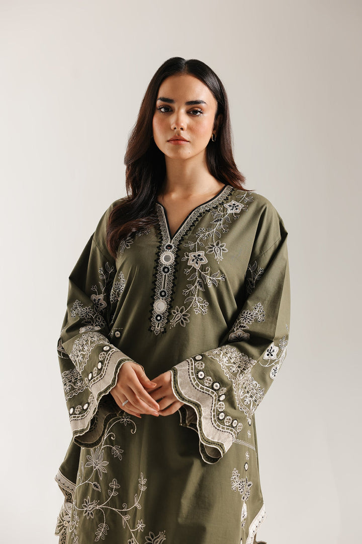 Step into earthy sophistication with this exquisite embroidered suit. The A line kurta, crafted in a rich olive green, is beautifully adorned with intricate white embroidery in detailed floral and vine patterns that flow gracefully down the front and across the wide, statement sleeves. The ensemble is perfectly completed with contrasting white culotte fit trouser that feature a striking wide border of matching floral and geometric embroidery at the hem, creating a refined and organically beautiful traditional look.