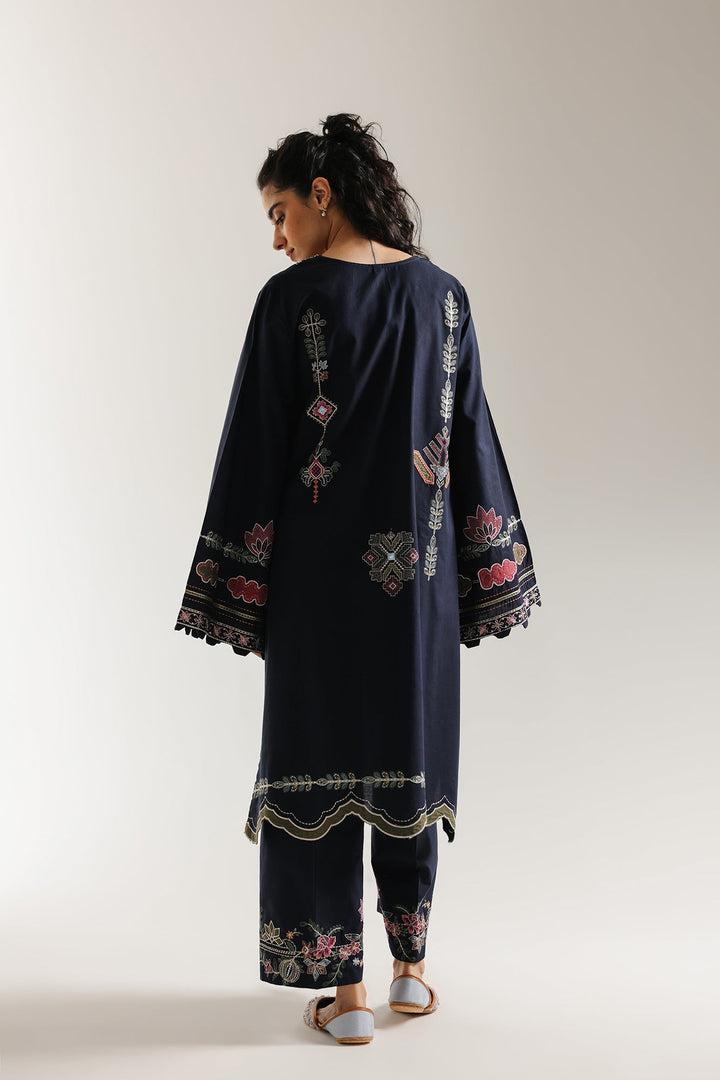 Immerse yourself in the deep, commanding allure of this navy blue embroidered suit. The long, A line kurta is crafted from a rich, dark blue fabric and is a canvas for striking multi-colored thread embroidery. Bold, intricate floral and traditional geometric patterns in white, pink, and green beautifully highlight the V-neckline, run in columns down the front panel, and adorn the wide sleeves. The hem is elegantly finished with a delicate scalloped edge. The ensemble is completed by coordinating navy trousers that feature matching elaborate embroidered borders at the hem, creating a perfectly balanced and traditional look of sophisticated luxury.