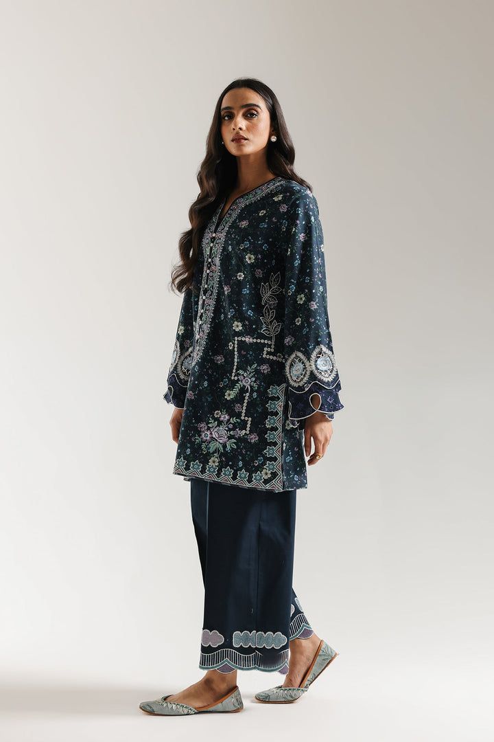 Step out in rich, artistic style with this sophisticated black embroidered suit. The straight-cut kurti is crafted from a dark, midnight blue fabric and features a detailed all-over floral print in shades of lilac and light blue. The front is elegantly accented with detailed multi-colored embroidery along the neckline. The long, wide sleeves are finished with contrasting borders and embroidery, adding to the visual depth. The suit is completed by tailored trouser in a matching dark blue. The hem of the trouser is adorned with an artistic scalloped embroidered border featuring cloud-like motifs, perfectly complementing the detailed top. This coordinated ensemble is ideal for an elevated, contemporary look.