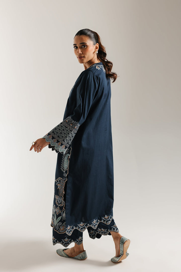 Envelop yourself in the deep, rich indigo of this captivating embroidered suit. The long, A line kurta is a masterpiece of symmetrical design, featuring dense traditional embroidery in cool tones of light blue, white, and subtle earthy shades. The embroidery forms striking floral, paisley, and geometric column motifs that beautifully structure the front panel and wide sleeves. The neckline is highlighted with fine stitching and a single line of subtle button details. The ensemble is perfectly completed by tailored trousers that feature a coordinating embroidered border at the hem, creating a sophisticated and deeply traditional look.