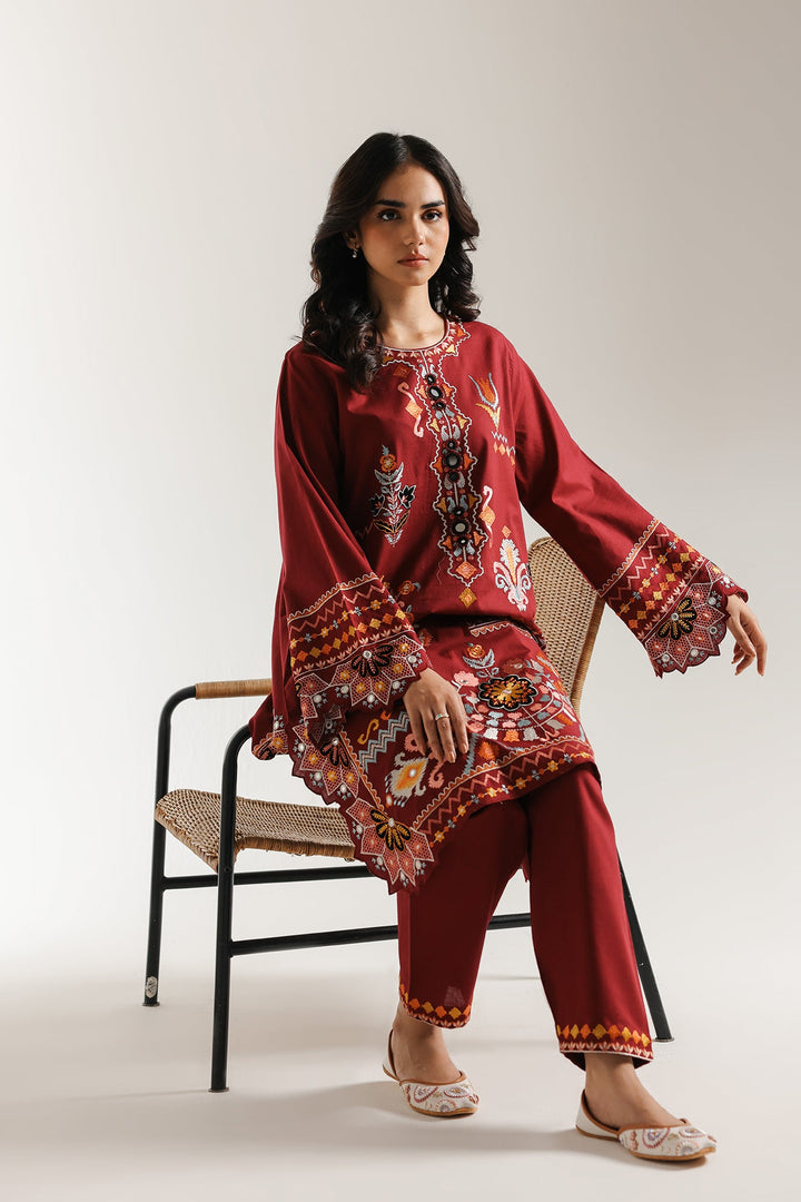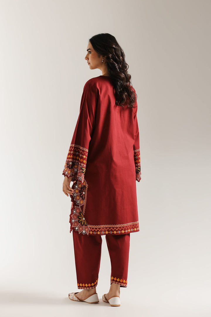 Step into festive sophistication with this striking deep red embroidered suit. The short, A line kurta is crafted from a rich, solid reddish-maroon fabric that contrasts beautifully with the intricate multi-colored thread embroidery. The design features bold, stylized floral and geometric patterns in white, yellow, orange, and blue, heavily concentrating around the neckline and forming vibrant borders on the wide sleeves. The hemline is dramatically finished with a scalloped cutwork border, adding an ornate touch. The ensemble is completed by coordinating straight-cut shalwar in the same deep red, ensuring a cohesive, luxurious, and visually impactful traditional look.