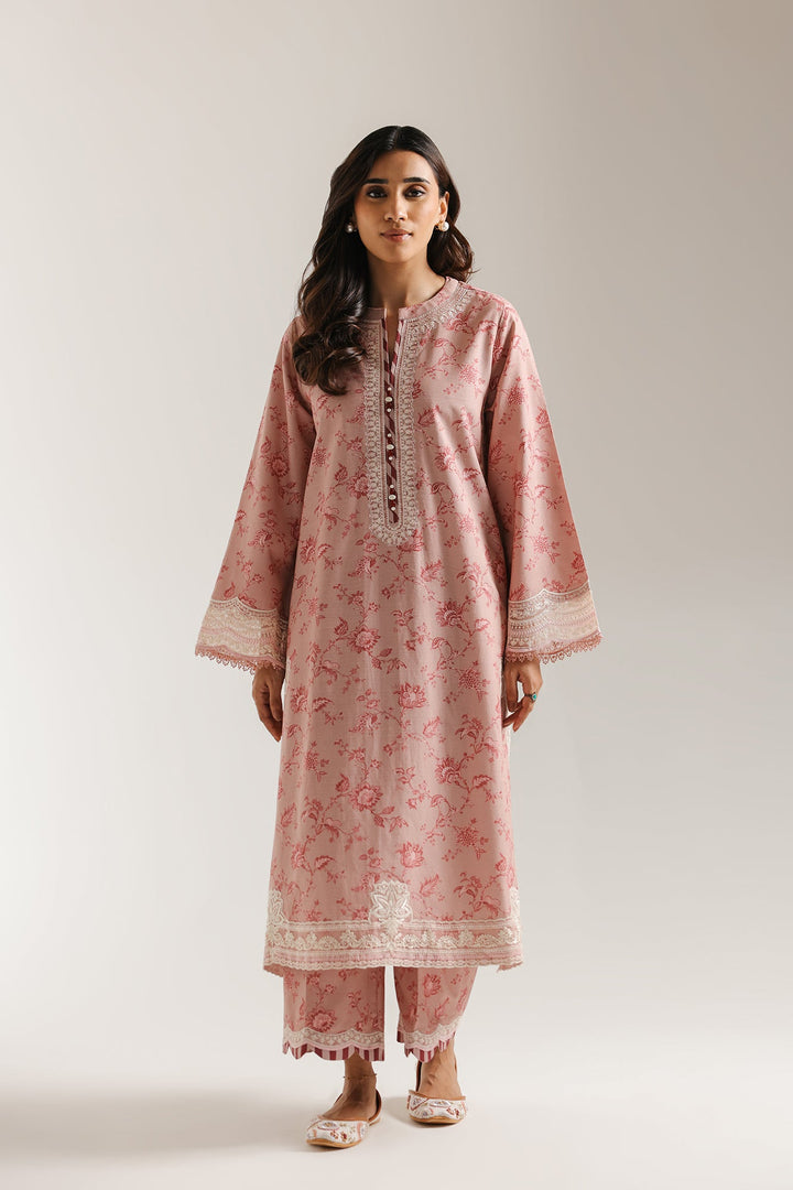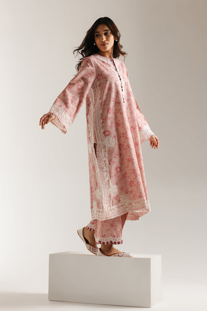 Indulge in the delicate beauty of this dusty rose embroidered suit. The long, A line-cut kurta is crafted from a soft fabric featuring an elegant monochrome floral print that covers the entire silhouette. The traditional band collar and slit neckline are beautifully highlighted with shimmering stones and intricate white thread embroidery. The wide sleeves and hem are finished with delicate cut-work lace, adding a touch of sophisticated femininity. The suit is perfectly completed with matching shalwar that feature delicate embroidery at the hem, creating a graceful and ethereal traditional look.
