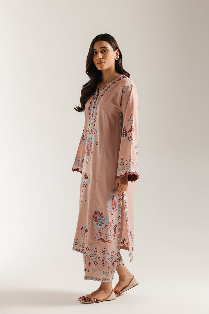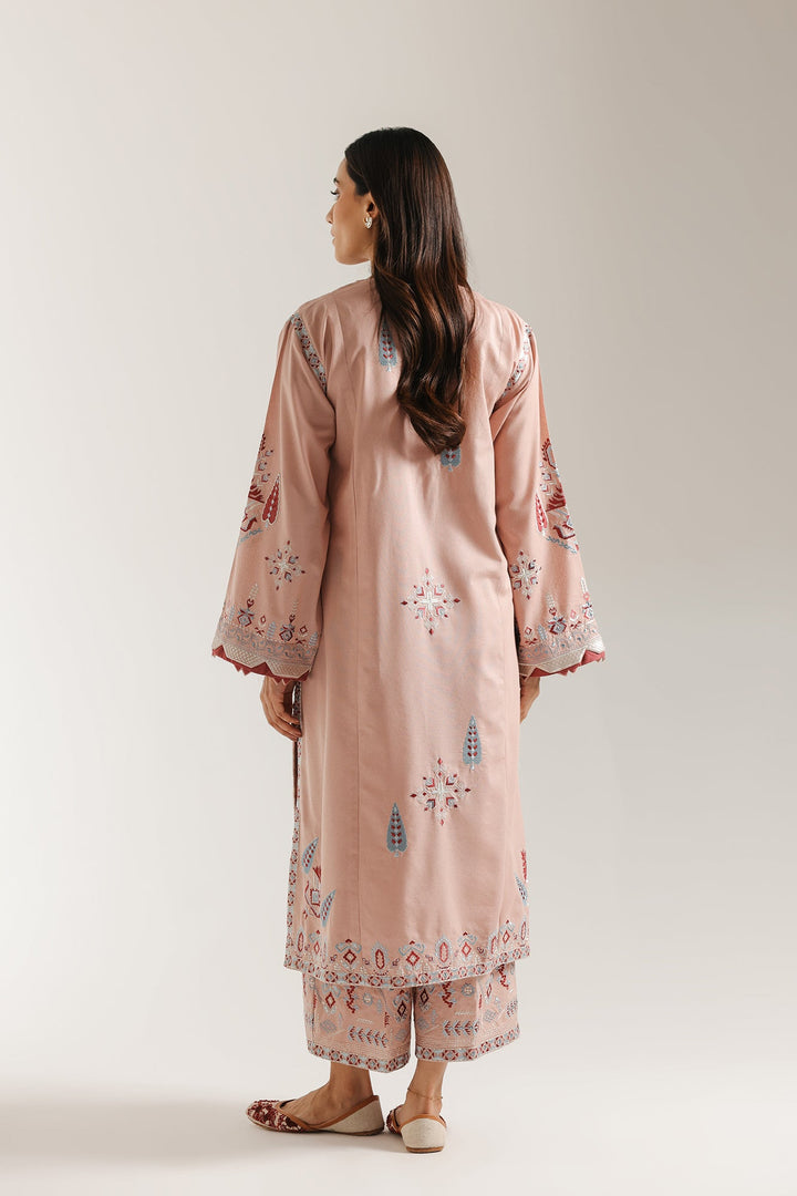 Immerse yourself in the gentle romance of this soft pink embroidered suit. The long, straight-cut kurta is beautifully embellished with exquisite, symmetrical thread embroidery. The detailed traditional motifs, executed in delicate shades of blue, sage green, and muted red, cascade down the front and wide sleeves. The V-slit neckline features fine border detailing and decorative tassels, adding a lovely, handcrafted touch. The ensemble is perfectly completed by coordinating trouser that carry matching embroidered details at the hem, creating a polished, graceful, and feminine traditional look.