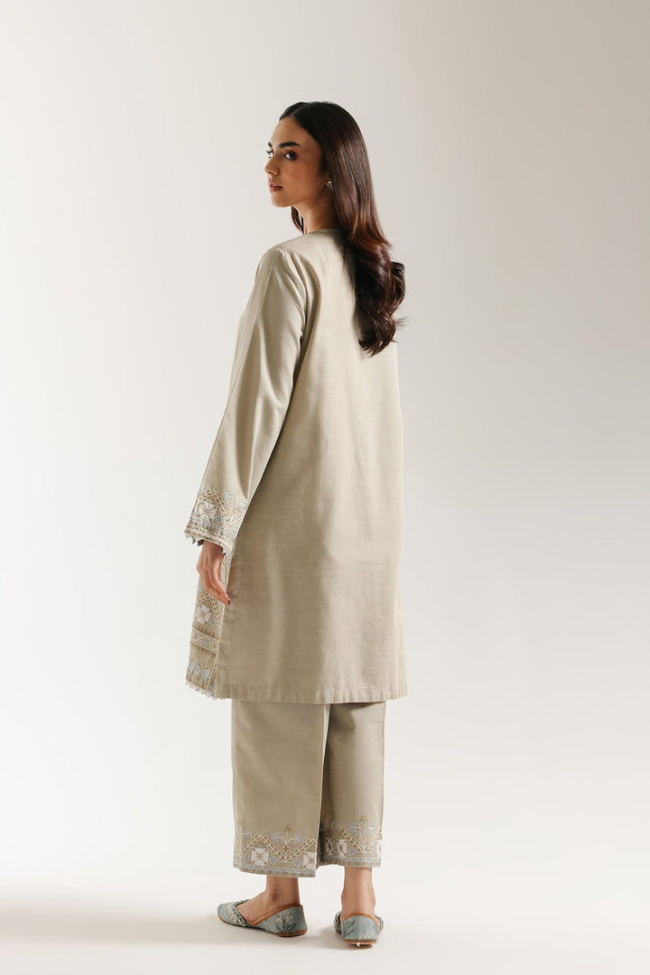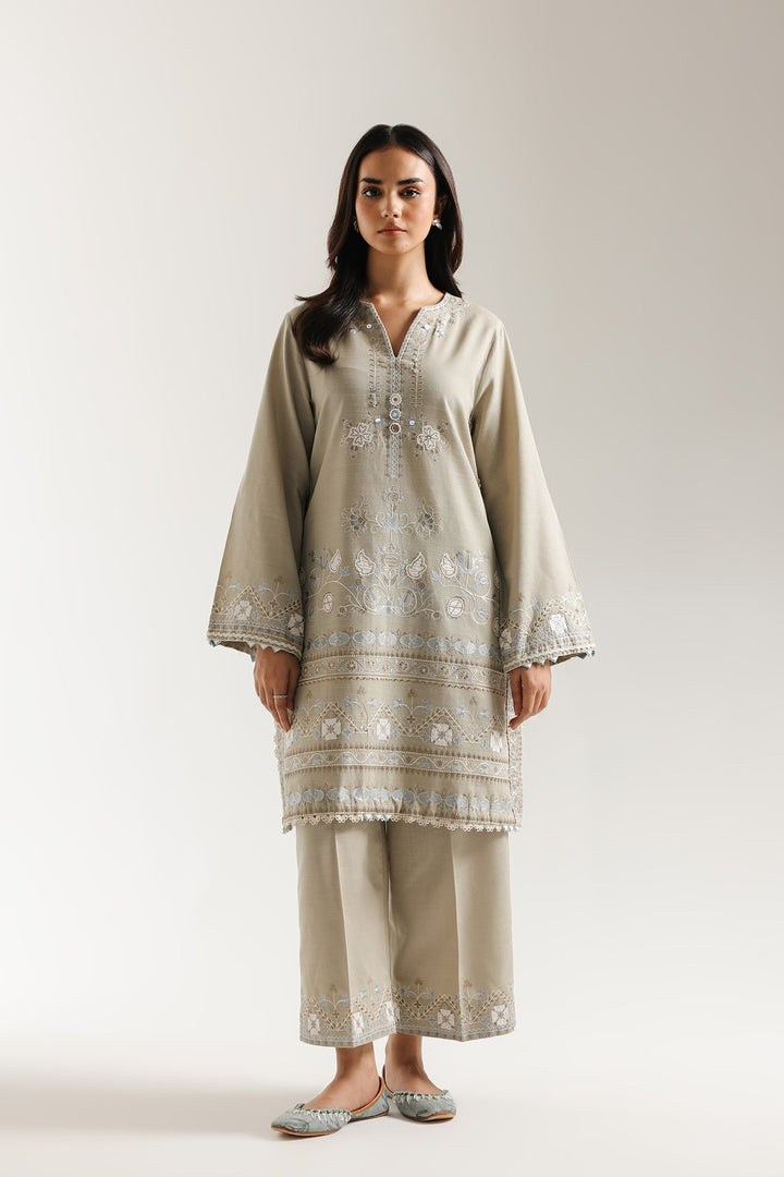 Bask in serene elegance with this stunning dove grey embroidered suit. The straight-cut kurta is crafted from a comfortable fabric in a stone grey hue and is beautifully adorned with intricate white and light blue thread embroidery. The embroidery features delicate floral and vine motifs that symmetrically cascade down the front, with beautiful border patterns encircling the hem and cuffs. The traditional V-slit neckline is accented with fine stitching. The ensemble is perfectly completed by comfortable, wide-leg trouser that feature matching embroidered borders and lace trim at the hem, creating a graceful, refined, and effortlessly chic traditional look.