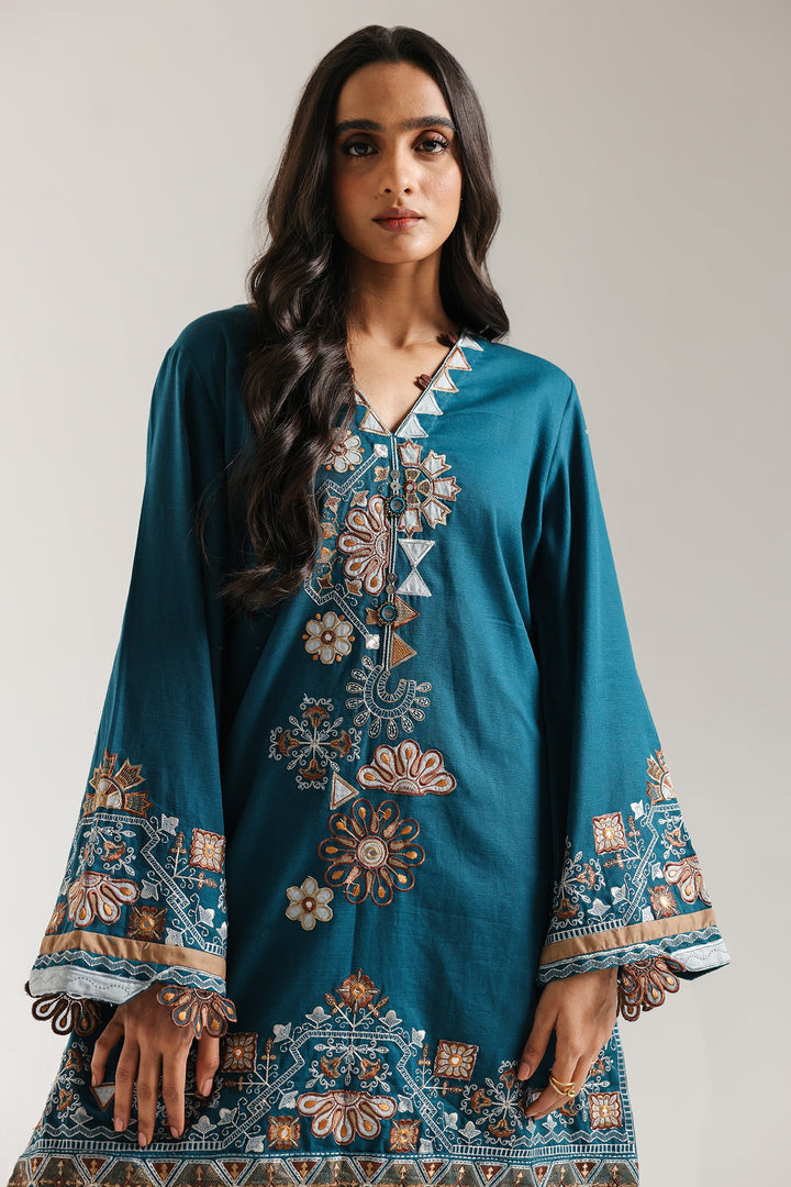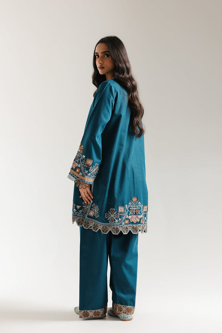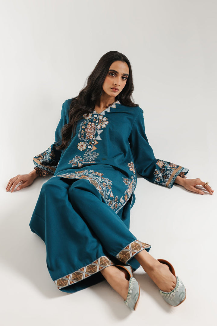 Dazzle in the deep, rich tones of this captivating teal embroidered suit. The A line kurti is fashioned from a beautiful, comfortable teal fabric. It is a masterpiece of craftsmanship, featuring heavy multi-colored embroidery in traditional floral and botanical patterns across the yoke, hem, and sleeves. The embroidery uses soft earth tones, contrasting whites, and hints of gold to create a luxurious texture and visual interest. The ensemble is completed by coordinating wide-leg shalwar in the same deep teal, which feature an ornamental scalloped embroidered border along the hem. This sophisticated and richly detailed suit is perfect for making a memorable statement at any festive or formal event