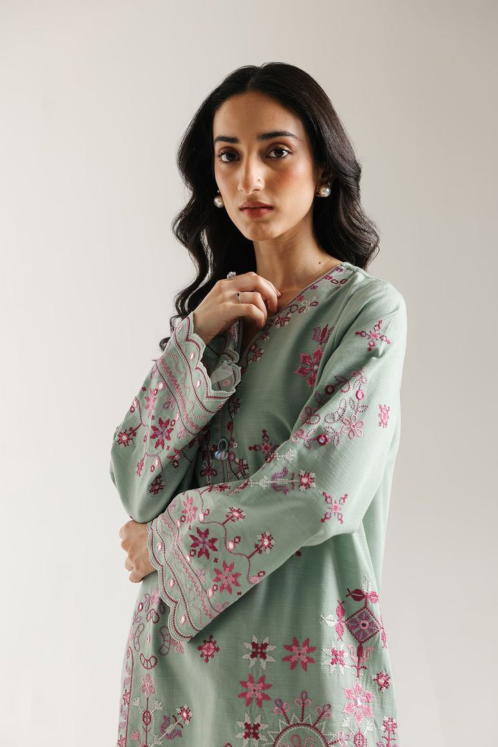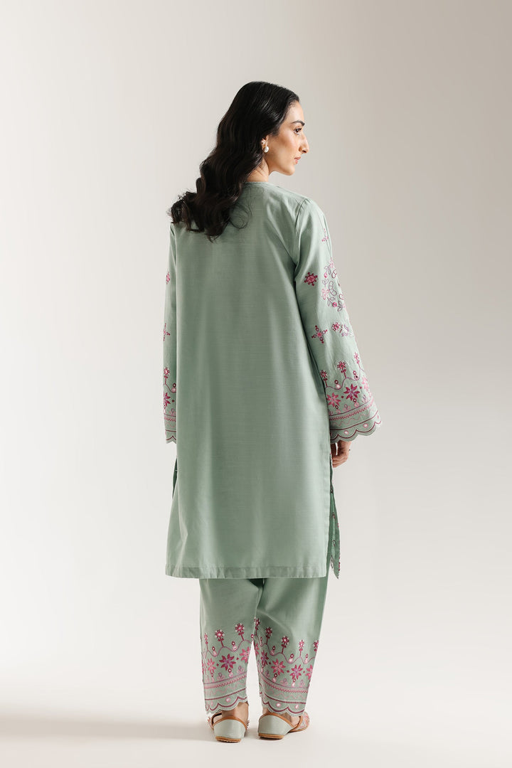 Drape yourself in the calming, artistic beauty of this sophisticated embroidered suit. The straight-cut kurta, crafted in a serene seafoam green, is richly adorned with intricate embroidery in beautiful shades of pink, magenta, and white. The geometric and floral patterns cascade across the front, hemline, and the wide, flowing sleeves, which are finished with an elegant scalloped edge. The ensemble is perfectly completed with voluminous shalwar in the matching hue, featuring complementary embroidery at the hem, creating a refined and gracefully detailed traditional look.