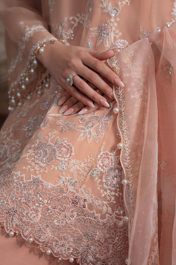 - This elegant 4-piece Coral Bloom suit features an organza embroidered shirt with detailed work on the front, back, and sleeves, complemented by an 80" embroidered patti on the hem and a 60" embroidered patti on the placket. The silk-dyed trousers are enhanced with a 60" embroidered patti for a refined finish. A matching silk-dyed slip offers comfort and cohesion, while the organza dupatta combines printed and embroidered elements to complete this sophisticated ensemble with grace and texture.