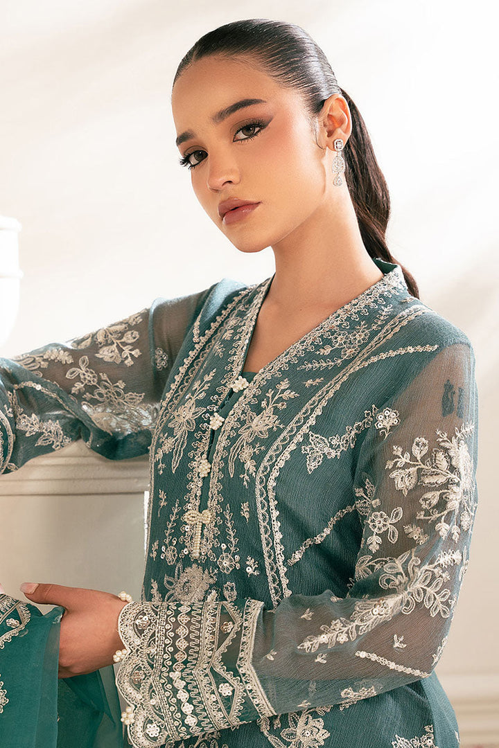 Expertly crafted with intricate embroidered details, the NORTH SEA-4PC NET EMBROIDERED SUIT includes a net shirt featuring stunning embroidery on the front, back, and sleeves, along with a patch for added elegance. The matching silk slip and trouser provide a luxurious touch, while the embroidered organza dupatta completes the ensemble with a touch of sophistication. Elevate your wardrobe with this exquisite suit.