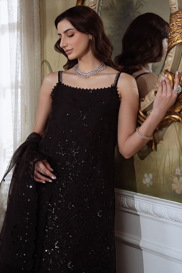 - This exquisite ONYX DREAM 4-piece suit features a beautifully embroidered organza shirt, including detailed motifs on the front, back, and sleeves, enhanced by a 60" embroidered patti along the placket for an elegant finish. Complementing the shirt is a silk-dyed trouser offering a smooth, luxurious feel. The ensemble includes a matching silk-dyed slip to ensure comfort and perfect layering, paired with a delicately embroidered organza dupatta that completes the sophisticated look. Perfect for formal occasions, this set balances intricate craftsmanship with refined fabrics for a stunning appearance.