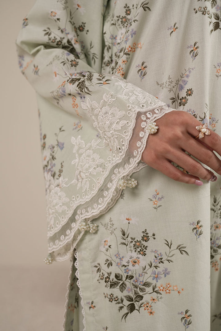 - This Pale Aqua 3-piece printed lawn suit features a lawn rotary printed shirt enhanced with 40 embroidered patti detailing on the sleeves, paired with a cambric dyed trouser for comfort and durability. The ensemble is completed with a matching lawn rotary printed dupatta, offering a refined and coordinated look suitable for warm weather.