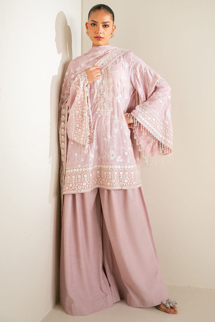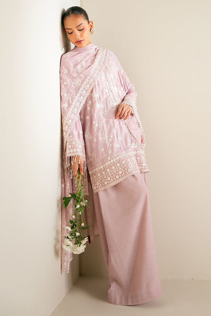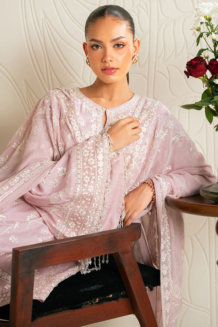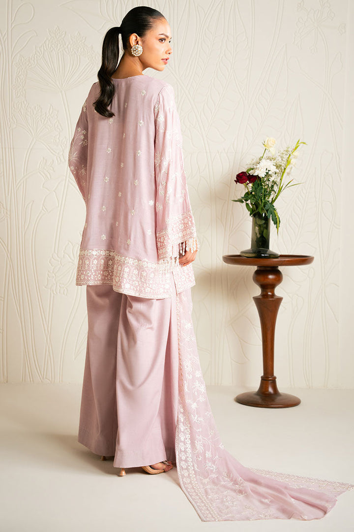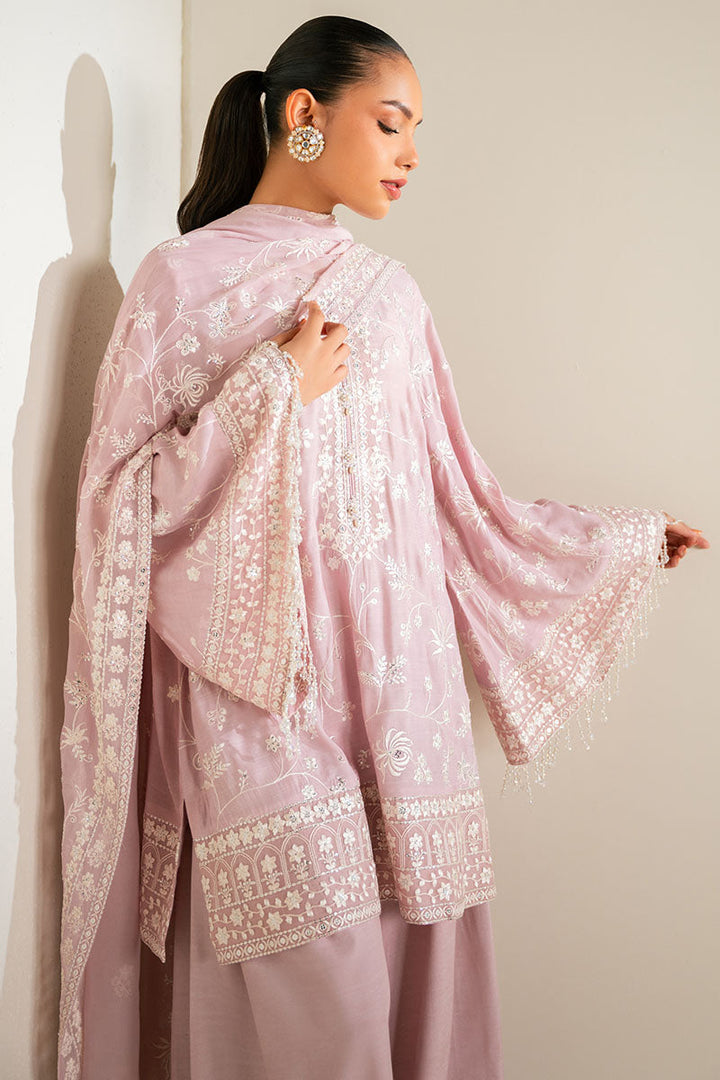- Elevate your wardrobe with the Quartz Pink 3PC Silk Embroidered Suit, featuring intricate silk embroidery on the front, back, and sleeves for a refined finish. The expertly embroidered neckline adds a touch of elegance to the shirt, paired with silk-dyed trousers that ensure comfort and style. Completing the ensemble is a delicate chiffon dupatta adorned with detailed embroidery, perfect for sophisticated occasions. This suit combines luxurious fabrics and craftsmanship for a timeless look.