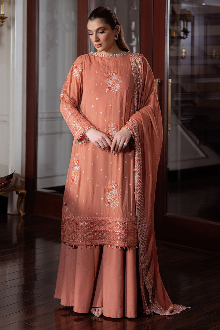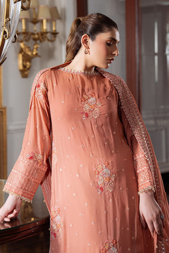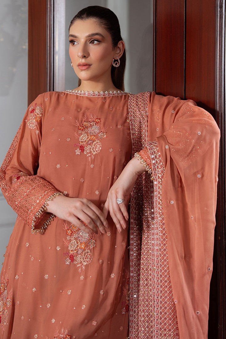 - This Sunset Dew 4PC Chiffon Embroidered Suit combines elegance and intricate craftsmanship. The suit features a chiffon shirt embroidered on the front, back, and sleeves, enhanced with extensive embroidered pattis on the hem, sleeves, back, and placket, adding refined detail. Complementing the shirt, the silk trousers are beautifully embroidered for a rich texture. A silk-dyed slip ensures comfort and a smooth fit beneath, while the chiffon embroidered dupatta completes the ensemble with graceful sophistication. Ideal for occasions where style and quality are paramount.