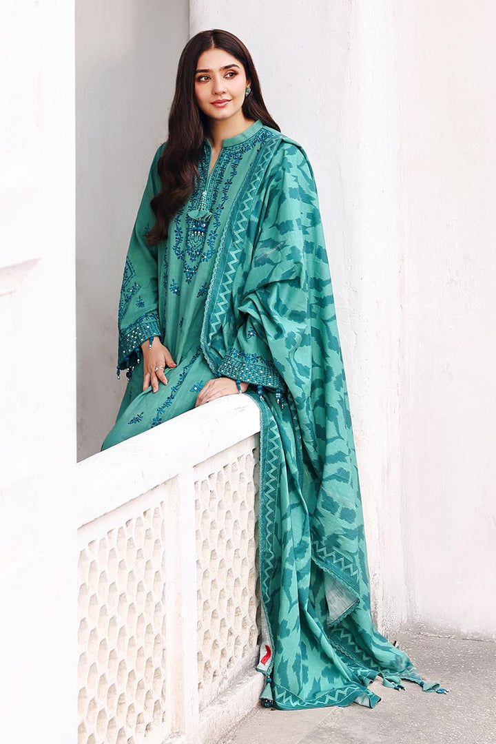 embroidered shirt with beautifully placed motifs that add depth and refinement to the look. The matching printed trousers bring a modern touch, while the khaddar printed dupatta adds visual interest with its bold pattern and cozy drape.