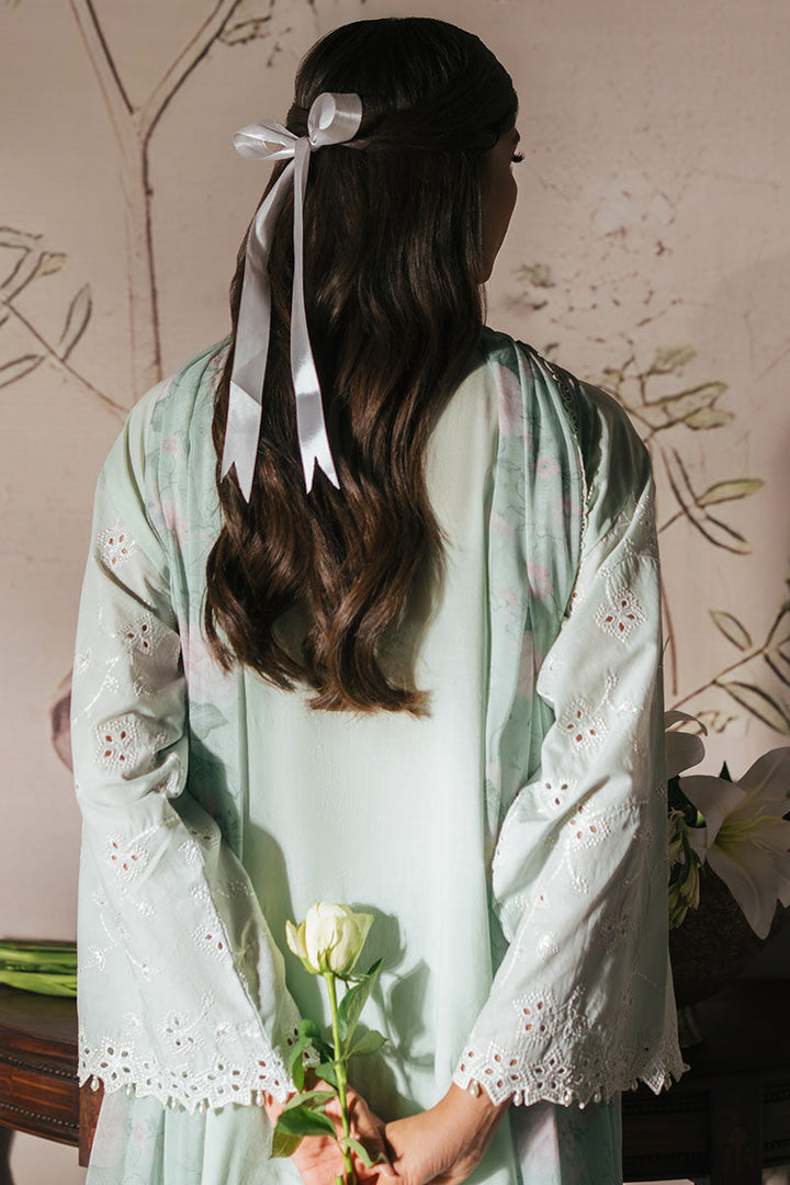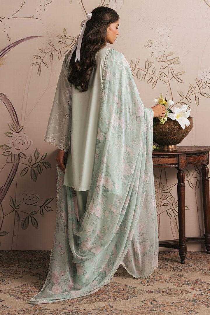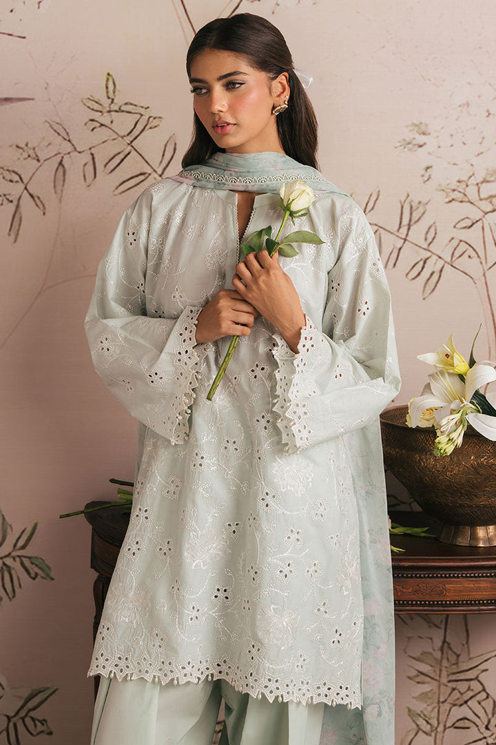 This elegant three-piece set features a chikankari lawn shirt with detailed embroidery on the front and sleeves, paired with a comfortably dyed cambric trouser. The ensemble is completed with a printed chiffon dupatta, combining traditional craftsmanship with contemporary comfort for a refined look.