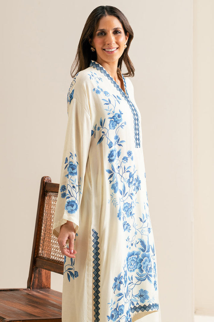 - The Gardenia Grace 2PC set features a straight loose-fit silk shirt with intricate front and back prints, complemented by detailed embroidery on the hem, side slits, and wrap-around neck for refined elegance. The printed box sleeves add a modern touch, while the accompanying poly organza dupatta boasts delicate embroidery, enhancing the overall sophistication and lightweight comfort of this ensemble.